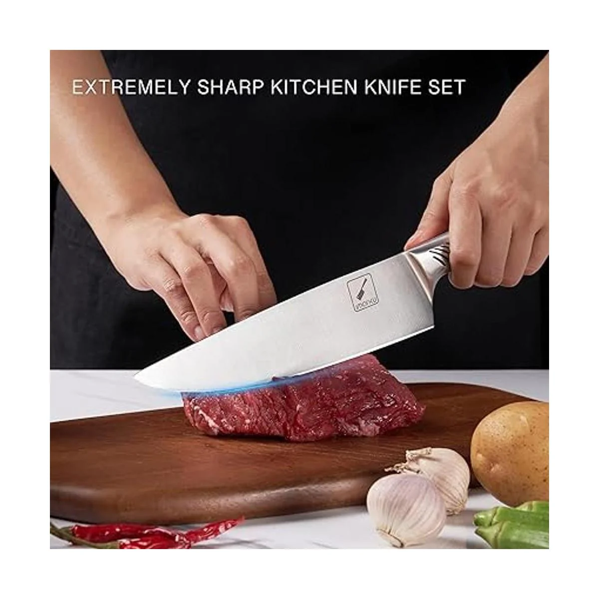 Juego de cuchillos de cocina de alta calidad: todos los cuchillos están hechos de acero inoxidable alemán HC, que tiene un excelente rendimiento en resistencia a las manchas, óxido, corrosión y excepcional retención de bordes. Cada hoja está procesada con precisión para garantizar que cada hoja mantenga su resistencia y función. Dureza Rockwell: 56 2 HRC