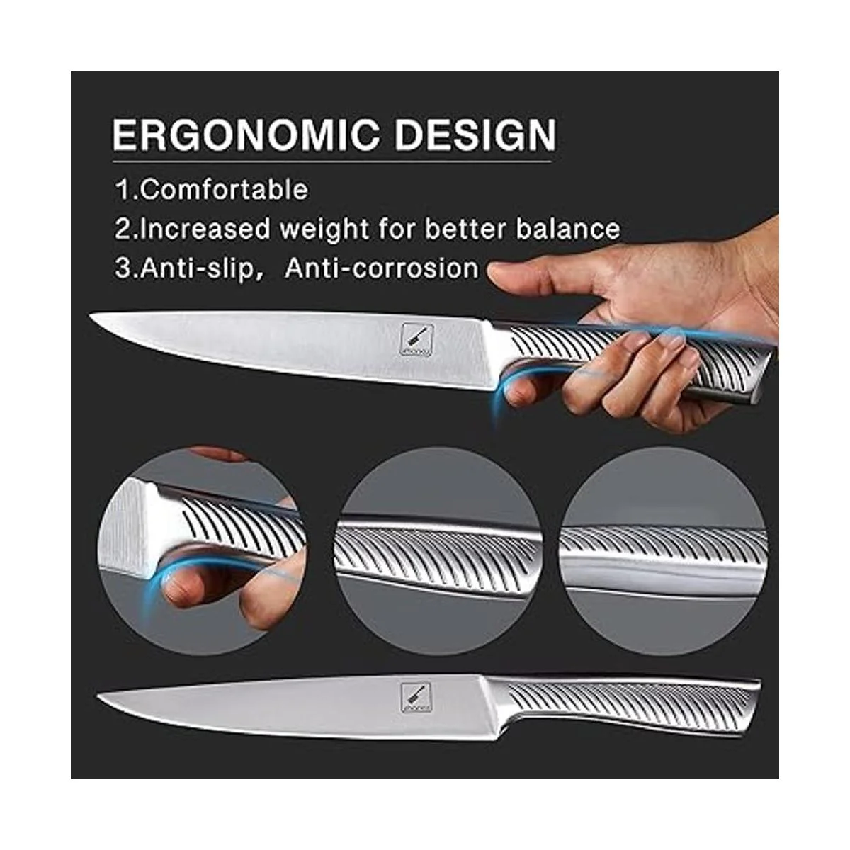 Cuchillos de cocina más cómodos: mango ergonómico de espiga completa que proporciona un agarre cómodo y flexible. Mayor peso del mango para mejorar el equilibrio. El mango adopta tecnología especial de electroforesis, superficie mediante el procesamiento especial de grano para un increíble antideslizante, óxido y corrosión.