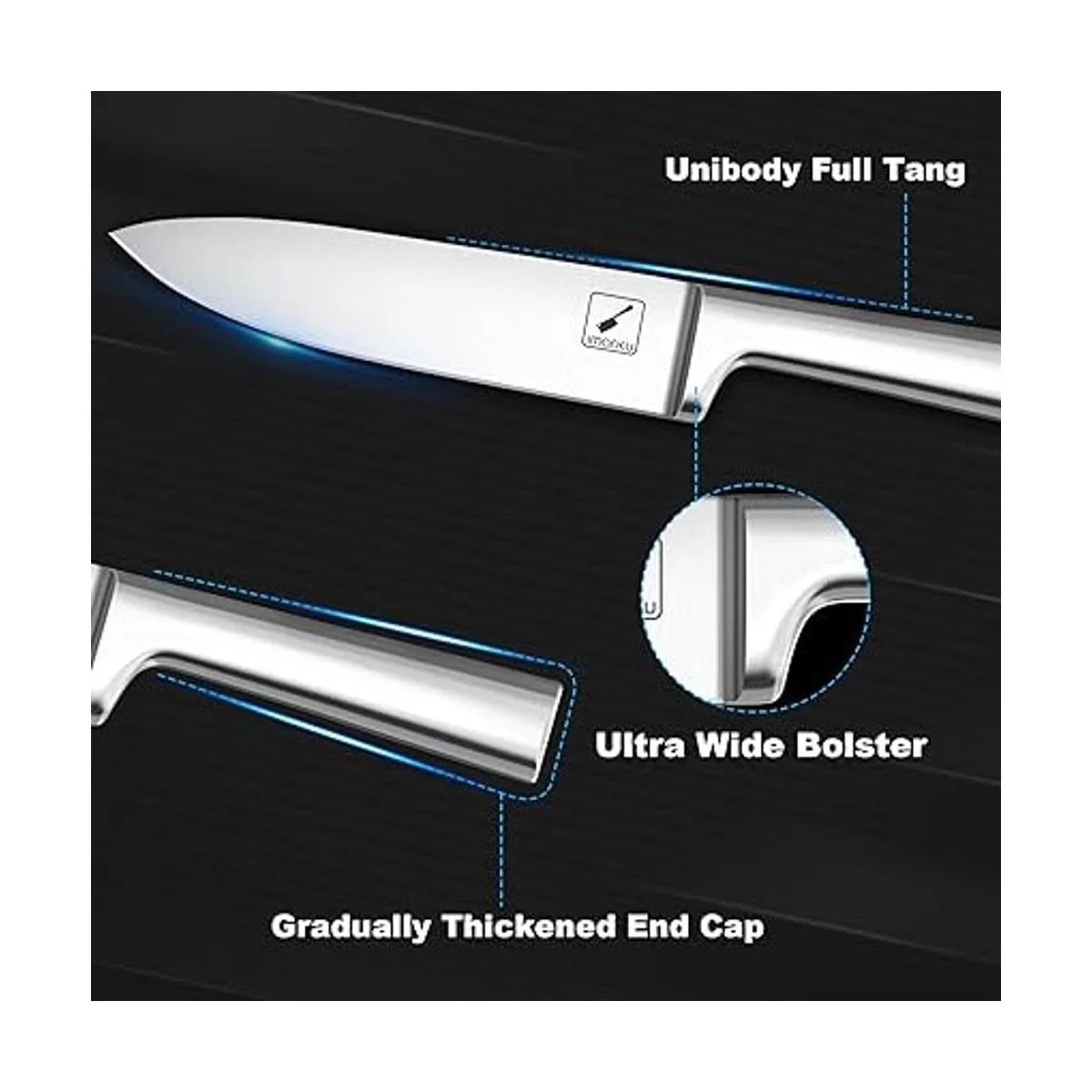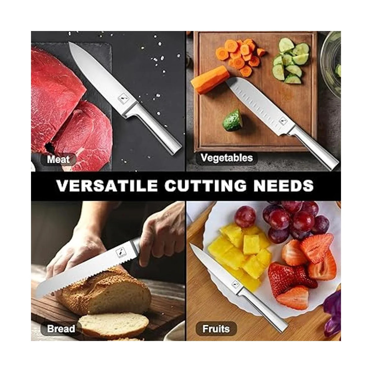 Juego de cuchillos ultra afilados: proceso profesional de templado fino en acero inoxidable japonés que logra una nitidez óptima y retención de bordes de afeitado duradera. Excelente rendimiento de corte del juego de cuchillos afilados garantiza un rebanado, corte en dados y corte preciso pero sin esfuerzo en cualquier preparación de alimentos. Disfruta cocinando, más diversión