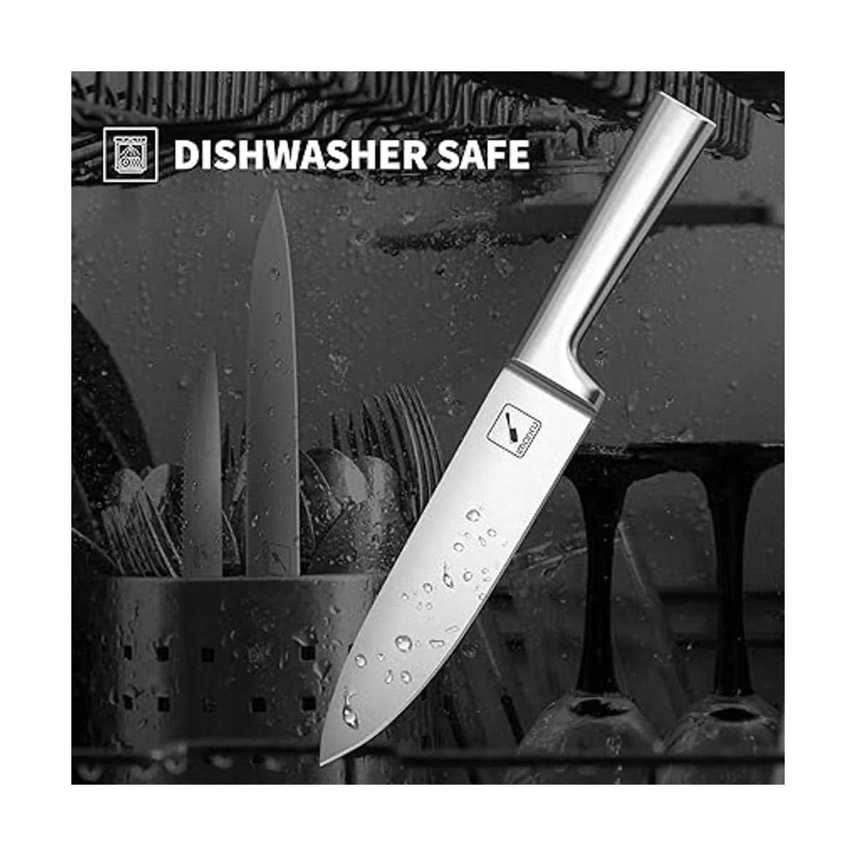 Fácil cuidado y almacenamiento: el juego de cuchillos de cocina imarku de 15 piezas incluye: cuchillo de chef, cuchillo santoku, cuchillo de pan, cuchillo de rebanar, cuchillo utilitario, cuchillo de pelar, tijeras multiusos, juego de 6 cuchillos de carne dentados, afilador de cuchillos y bloque. El juego de cuchillos de cocina está bien organizado en bloque de cuchillos de madera, mantiene ordenado y ahorra espacio. Consejos: el juego de cuchillos de cocina es apto para lavavajillas, pero lavar a mano es mejor para una nitidez y vida útil más largas Limpia el agua después de la limpieza y colócala en un lugar seco y ventilado
