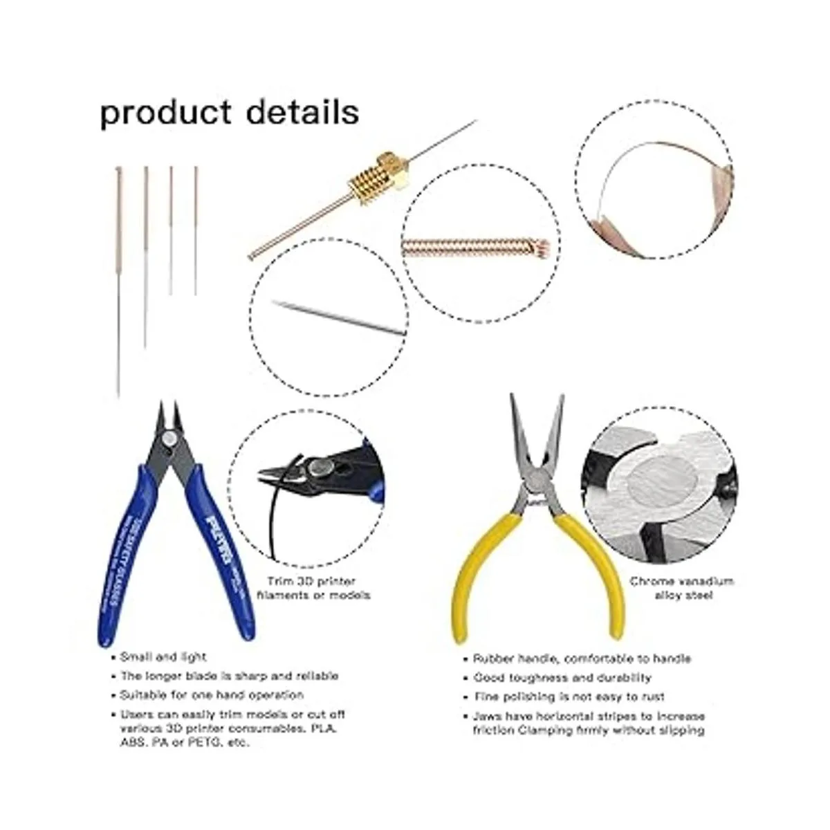 Combinación profesional : 35 herramientas de impresión 3D que pueden ayudarte mejor con tus proyectos de impresión. Incluye: 1 caja de herramientas portátil, 2 pinzas, 2 llaves, 1 mini alicates de puntero, 5 llaves hexagonales, 1 cortaherramientas, 1 raspador de herramientas de extracción, 4 limpiadores de boquillas, 2 archivos, 6 cuchillos de herramientas de tallado, 1 raspador con 10 cabezales de cuchillos. ,2x cepillo de limpieza cepillo de Juego, 1 pegamento sólido, 1 lubricantes. Puede ayudarte a completar tu trabajo rápida y felizmente.