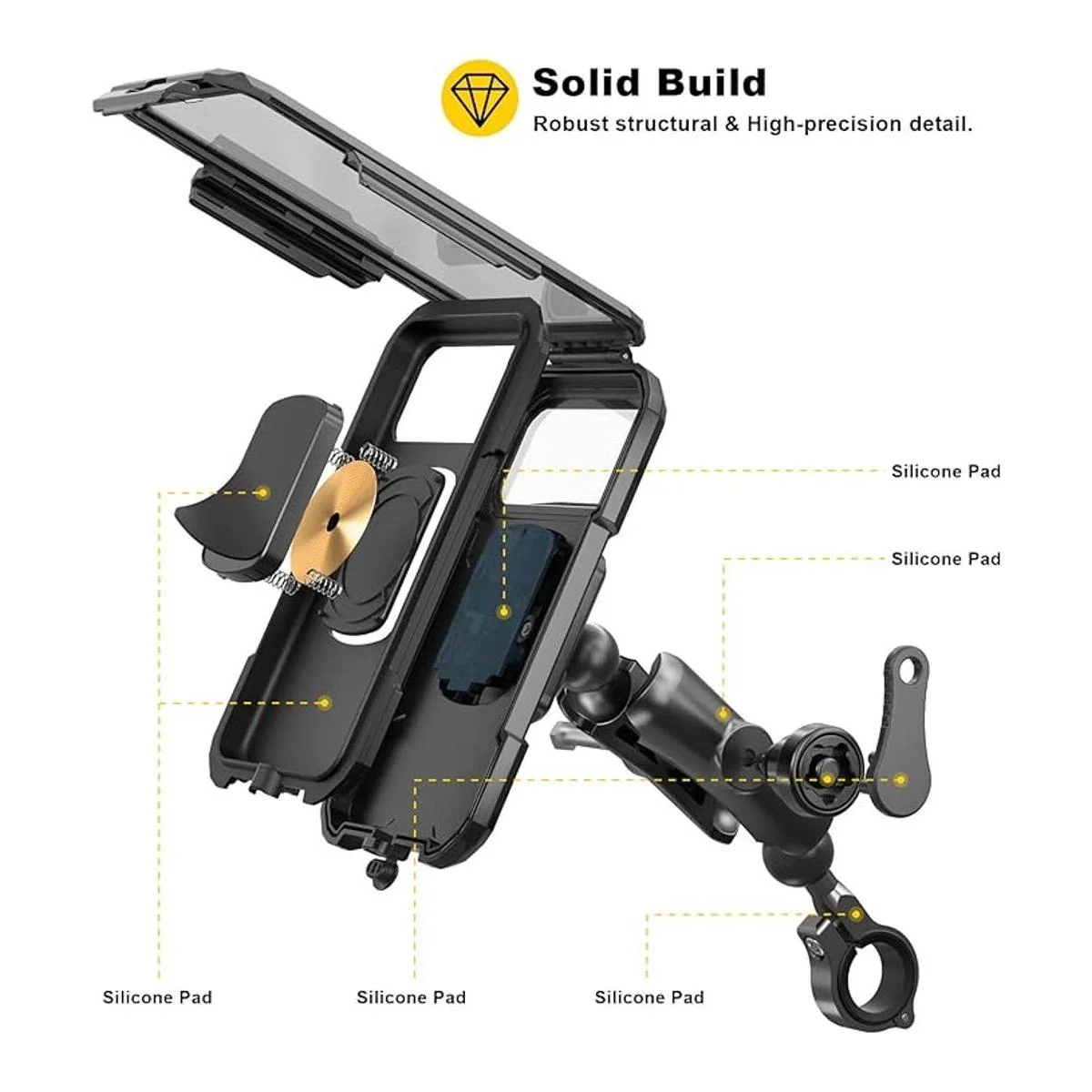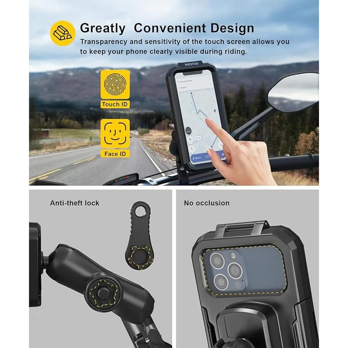 Pantalla táctil sensible: construido con funda impermeable IP67, la pantalla táctil sigue funcionando perfectamente a través de la funda del teléfono de la motocicleta. La pantalla táctil de alta sensibilidad de este soporte impermeable para teléfono de bicicleta es compatible con identificación facial/identificación táctil.