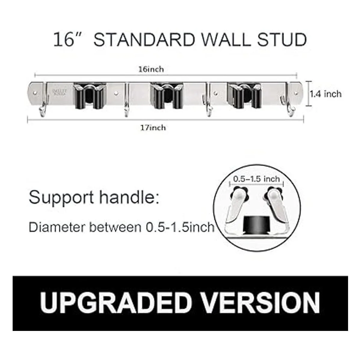Actualización 2020: el tamaño del soporte para escobas es de 17 x 1.4 x 0.08 pulgadas. La distancia del agujero de instalación se basa en el espaciado estándar de 16 pulgadas para la colocación de los pernos. 4 agujeros de montaje y juego de tornillos hacen que el soporte de escoba sea más resistente en la pared. El anclaje de pared mejorado se adapta a todo tipo de paredes.