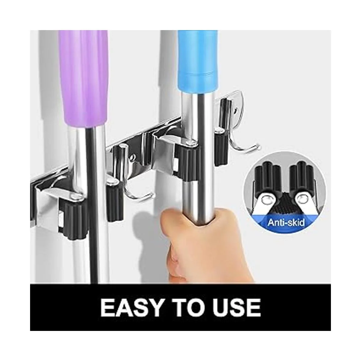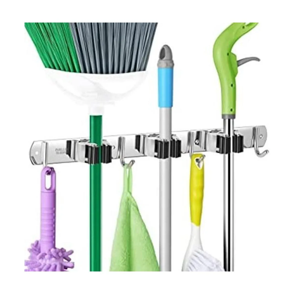 IMILLET Soporte para escoba y fregona montado en la pared, soporte para escoba de acero inoxidable, soporte para fregona, organizador de almacenamiento para el hogar, lavandería, jardín, garaje 3 estantes con 4 ganchos