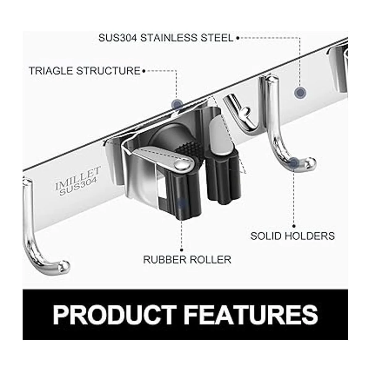 IMILLET Soporte para escoba y fregona montado en la pared, soporte para escoba de acero inoxidable, soporte para fregona, organizador de almacenamiento para el hogar, lavandería, jardín, garaje (3 estantes con 4 ganchos)
