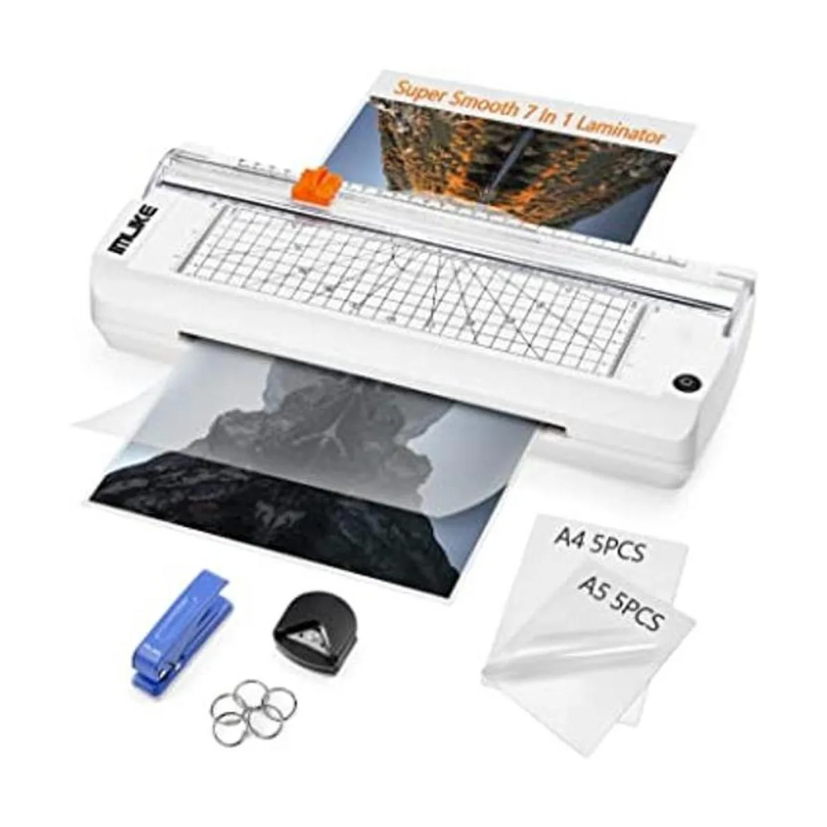 Conveniente Esta nueva laminadora de diseño está integrada con la recortadora de papel que no es como la otra marca de laminador separada. Mientras tanto, este kit de laminadora incluye 1 redondeador de esquina, 1 perforadora de un solo agujero, 5 anillas de libro, 5 hojas A4 y 5 hojas A5. Te ofrecemos una experiencia de compra práctica y económica.