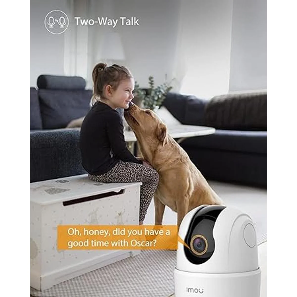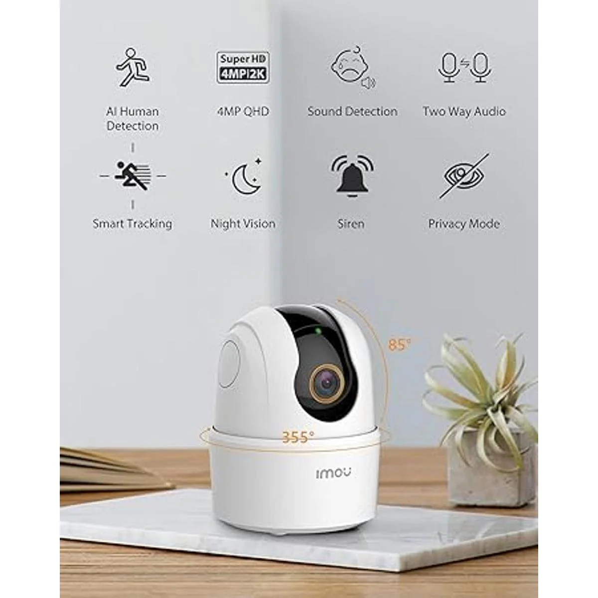 Visión remota de 360 y audio de 2 vías: esta cámara interior tiene rotación horizontal de 0 355 y vertical de 5 80. Mira cada rincón de tu hogar con un fácil control de inclinación a través de la aplicación Imou Life mientras estás fuera. Altavoz y micrófono integrados que te permiten interactuar con tu familia y mascotas