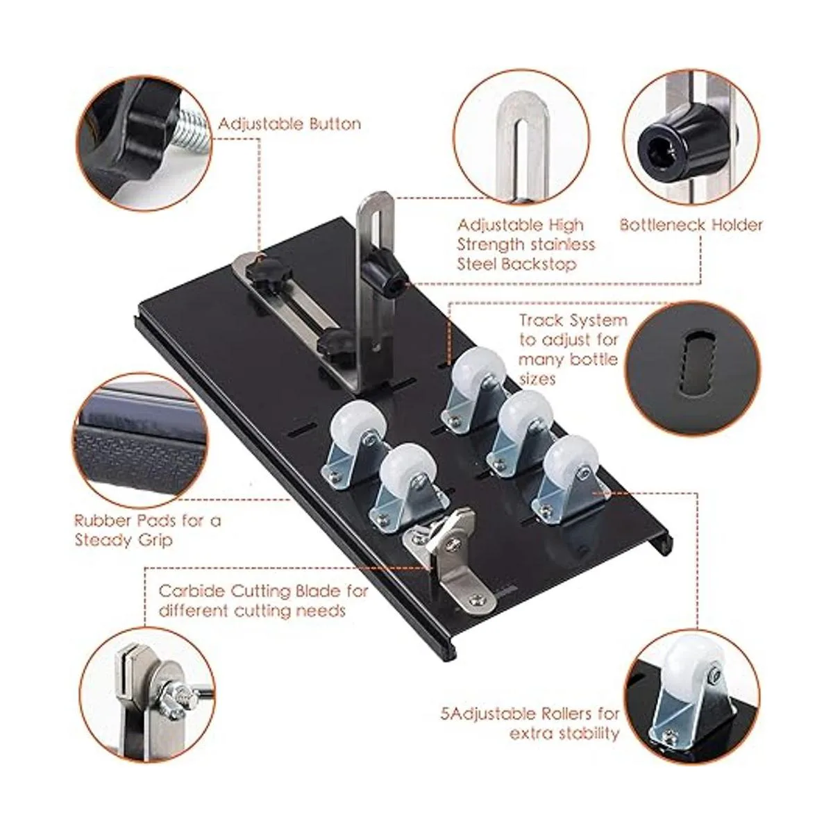 Diseño actualizado 2022 para botella de vidrio: este cortador de botellas de vidrio está diseñado para cortar botellas redondas y cuello de botella, la longitud de la hoja de corte a la placa de soporte se puede ajustar, adecuado para cortar cuerpo de botella de vidrio de 5 a 7.5 pulgadas de longitud, y diámetro de 1.6 a 4 pulgadas. Nuevo diseño de soporte para botellas diseñado para cortar cuello de botella, 5 ruedas de apoyo especialmente diseñadas que pueden estabilizar el corte de la botella.