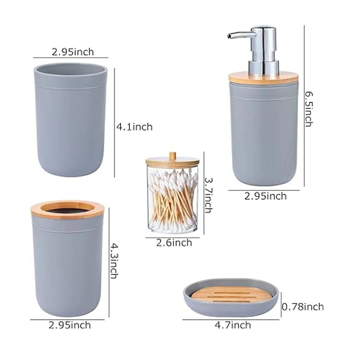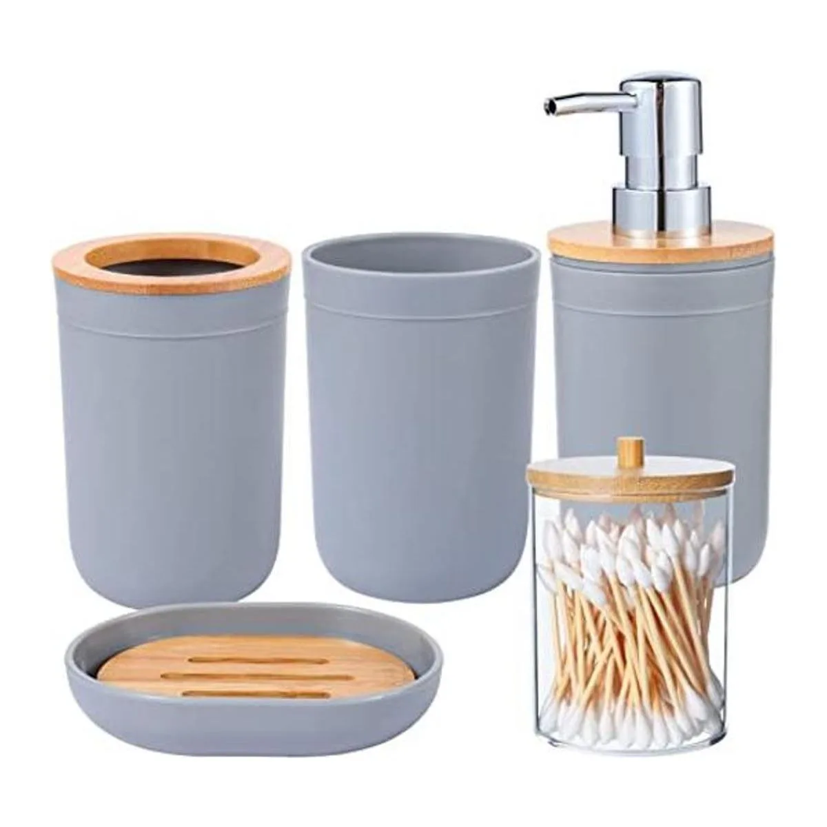 iMucci Juego de 5 accesorios de baño de plástico, decoración para el baño, con soporte y vaso para cepillos de dientes, dispensador de jabón y jabonera gris, con bambú