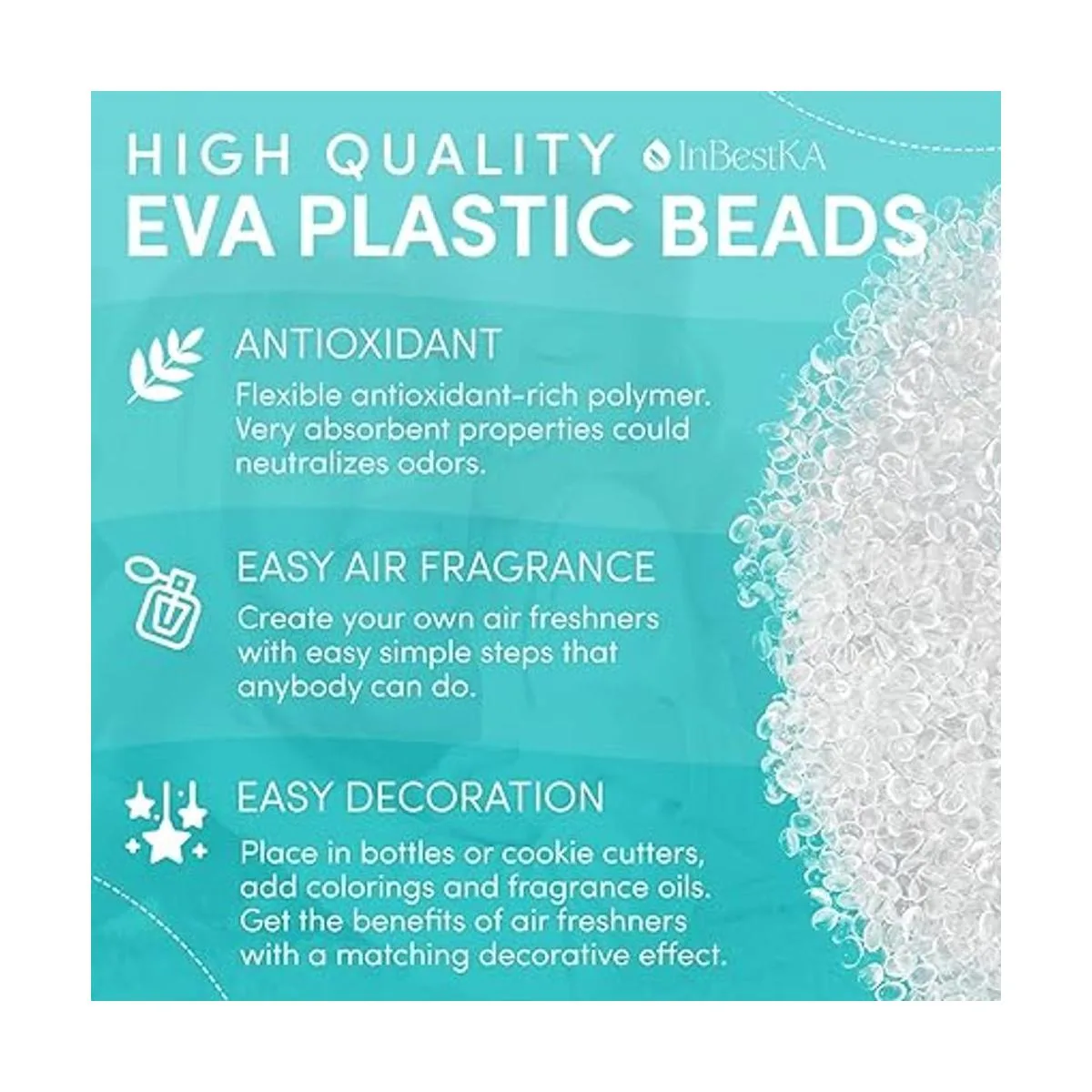 Por qué InBestKa Nuestras cuentas de aroma sin perfume a granel están hechas de plástico EVA de alta calidad, que es un polímero flexible rico en antioxidantes, propiedades muy absorbentes que pueden neutralizar el olor para una fragancia duradera.