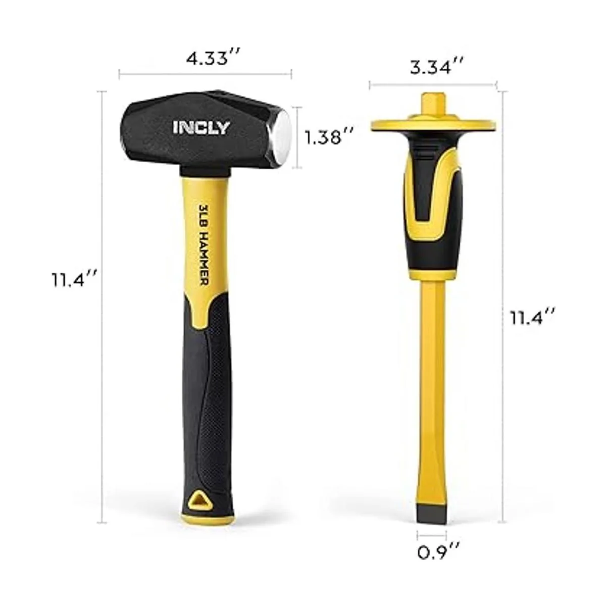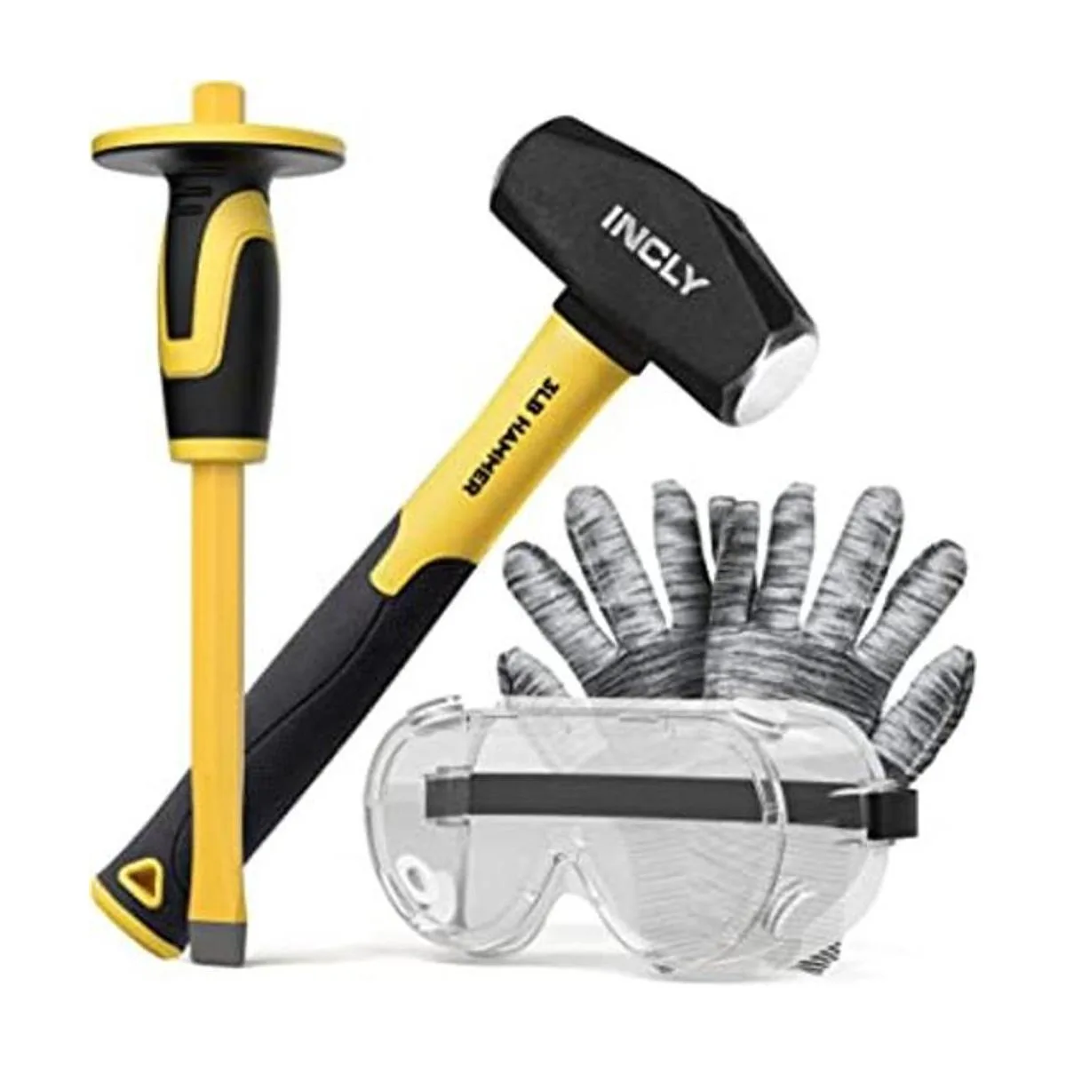 INCLY Juego de 4 piezas de equipo de geología, martillo de trineo de 3 libras, cincel plano de hormigón Mason de 12 pulgadas, gafas de seguridad, guantes, juego de herramientas para persecución, minería y prospección de oro, rotura de piedra de ladrillo