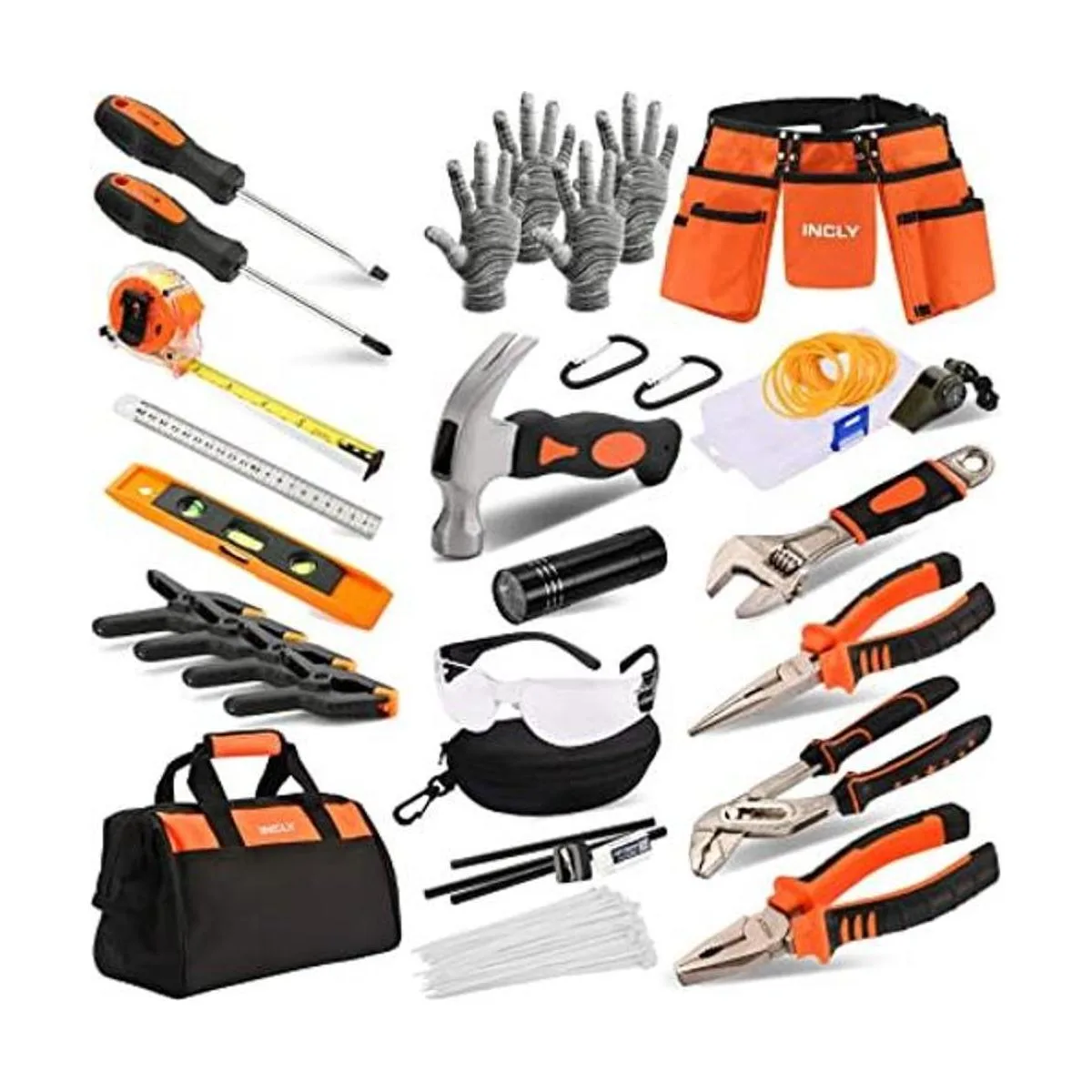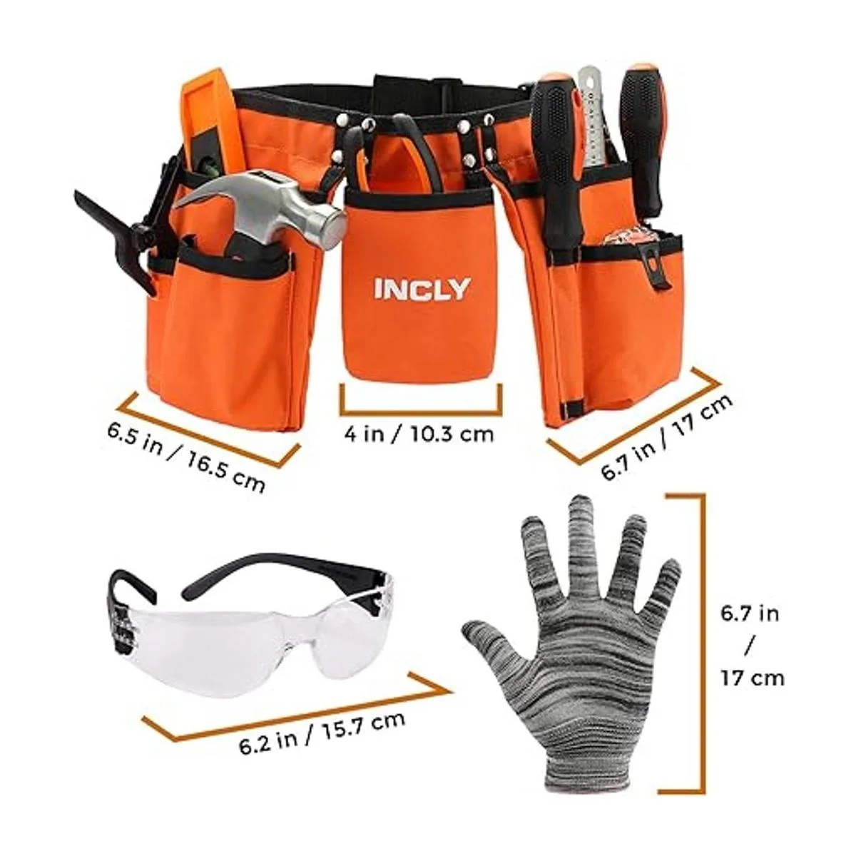 INCLY Juego de 95 herramientas reales para niños, kit de herramientas manuales pequeñas y reales para construcción, accesorios de aprendizaje, destornillador de martillo para el hogar, bricolaje, juego de carpintería, viene con cinturón de herramientas y bolsa