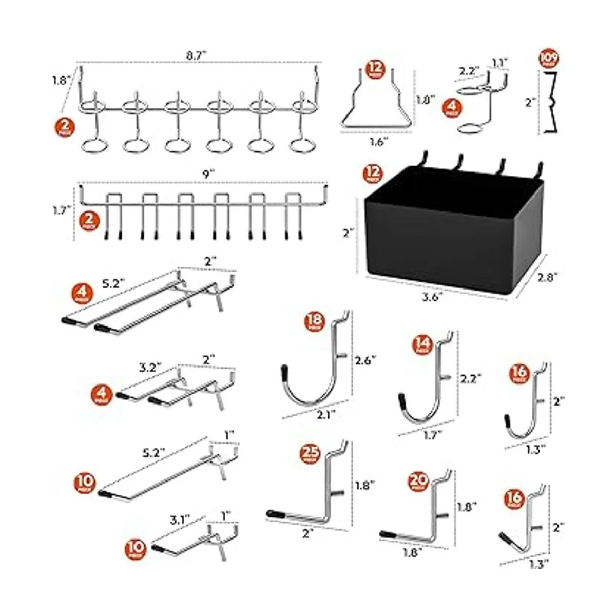 1. Paquete económico: viene con 278 accesorios para tablero de clavijas, 16 ganchos de tablero de clavijas de diferentes tipos, incluyendo 12 contenedores de tablero de clavijas, ganchos curvos, ganchos angulados, ganchos rectos y soporte de herramientas de anillo, estante multiherramientas