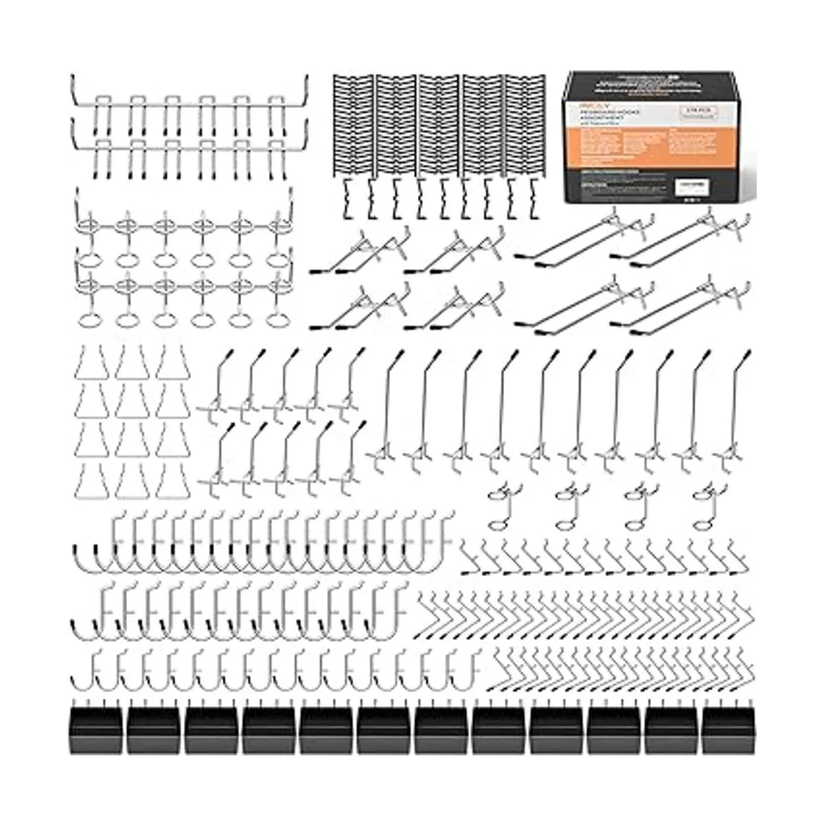 INCLY Kit organizador de 278 piezas de accesorios para tablero de clavijas con cubos para organizar varias herramientas, surtido de ganchos para tablero de clavijas de 18 y 14 de pulgada para almacenamiento colgante, accesorios de pared de garaje