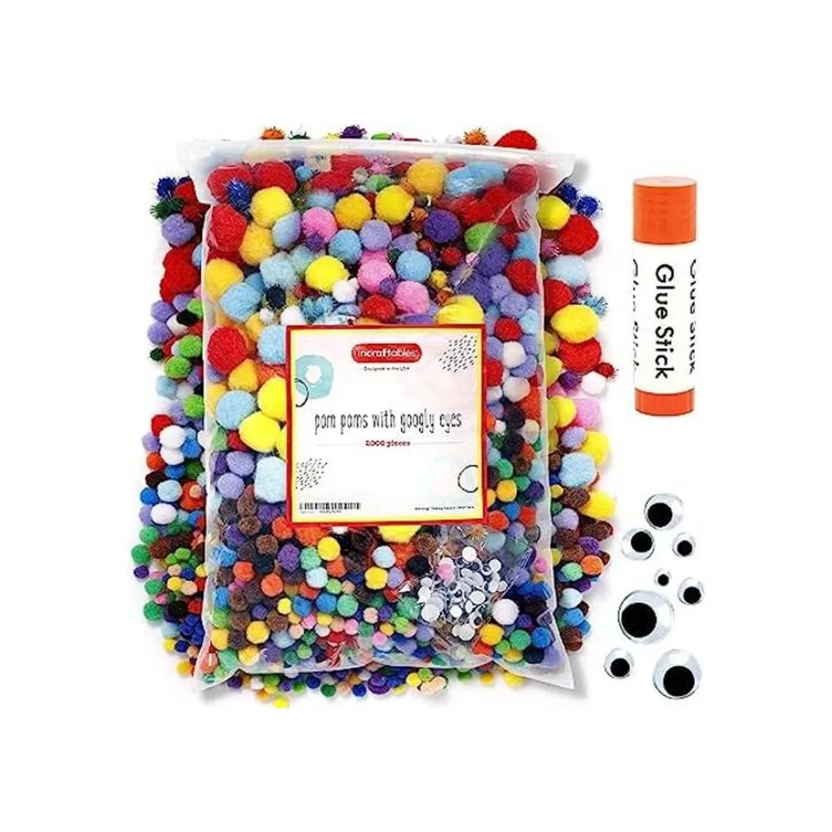 Incraftables 2000 pompones con ojos y palo de pegamento. El mejor color y purpurina de algodón de 0.4 a 1.4 pulgadas para manualidades, sombreros y decoraciones. Juego de regalo de pompones inflados multicolor para niños y adultos