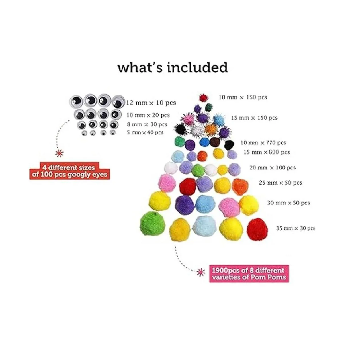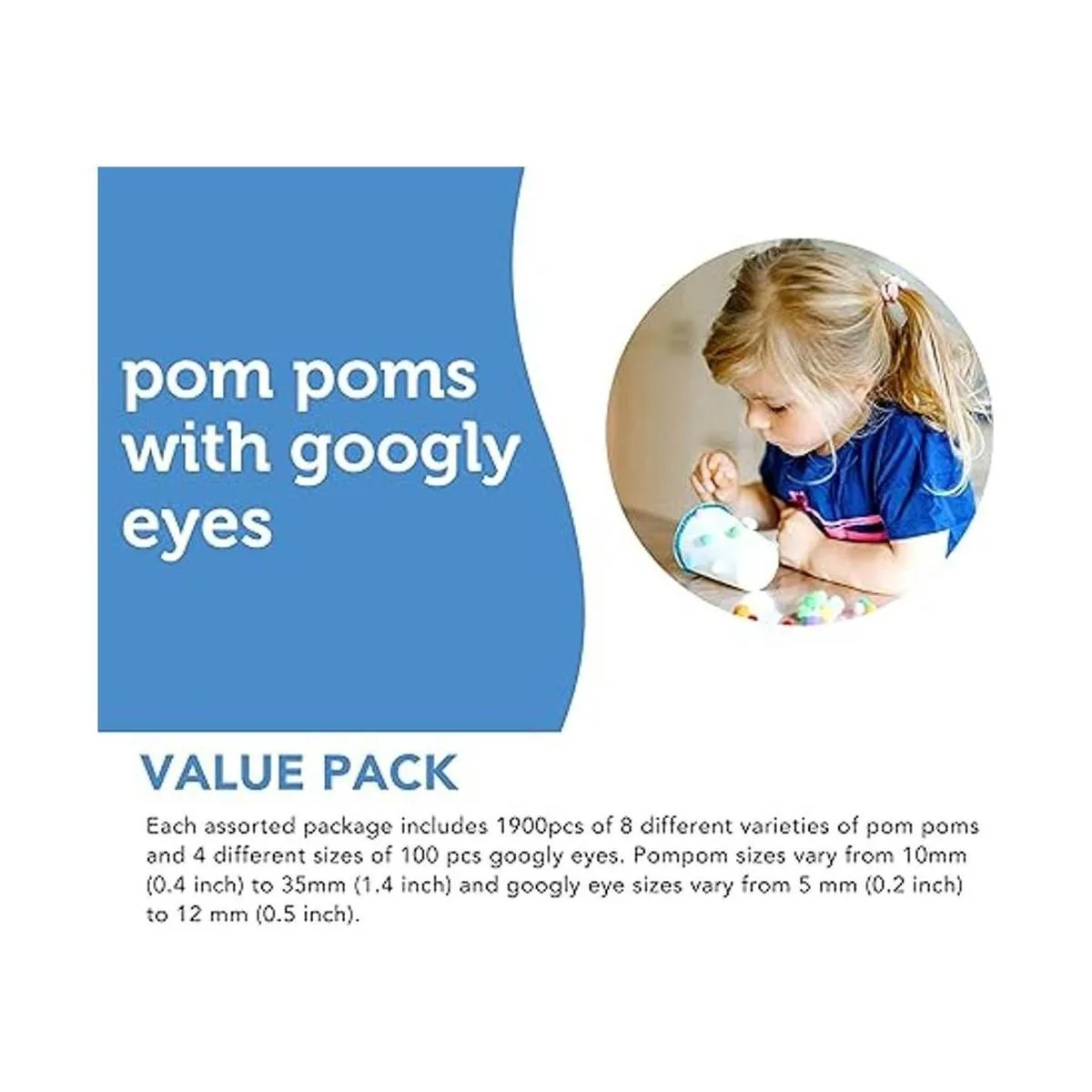 Paquete económico: cada paquete surtido incluye 1900 piezas de 8 variedades diferentes de pompones y 4 tamaños diferentes de 100 ojos saltones Los tamaños de los pompones varían de 0.394 in a 1.378 in y los tamaños de ojos saltones varían de 0.197 in a 0.472 in.