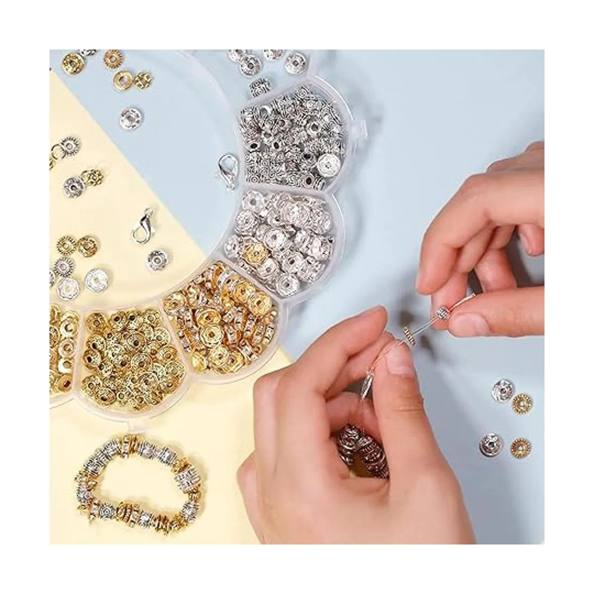 Paquete económico: cada paquete a granel incluye 12 estilos 6 plateados y 6 dorados 600 cuentas espaciadoras para hacer joyas, incluyendo 50 bolas de estilo tibetano, cuentas espaciadoras de cristal Rondelle, cuentas de flores 3D, cuentas de diamantes de imitación y cuentas espaciadoras regulares. Este juego también incluye hilo elástico, 15 cierres, 15 anillos de salto y caja organizadora.