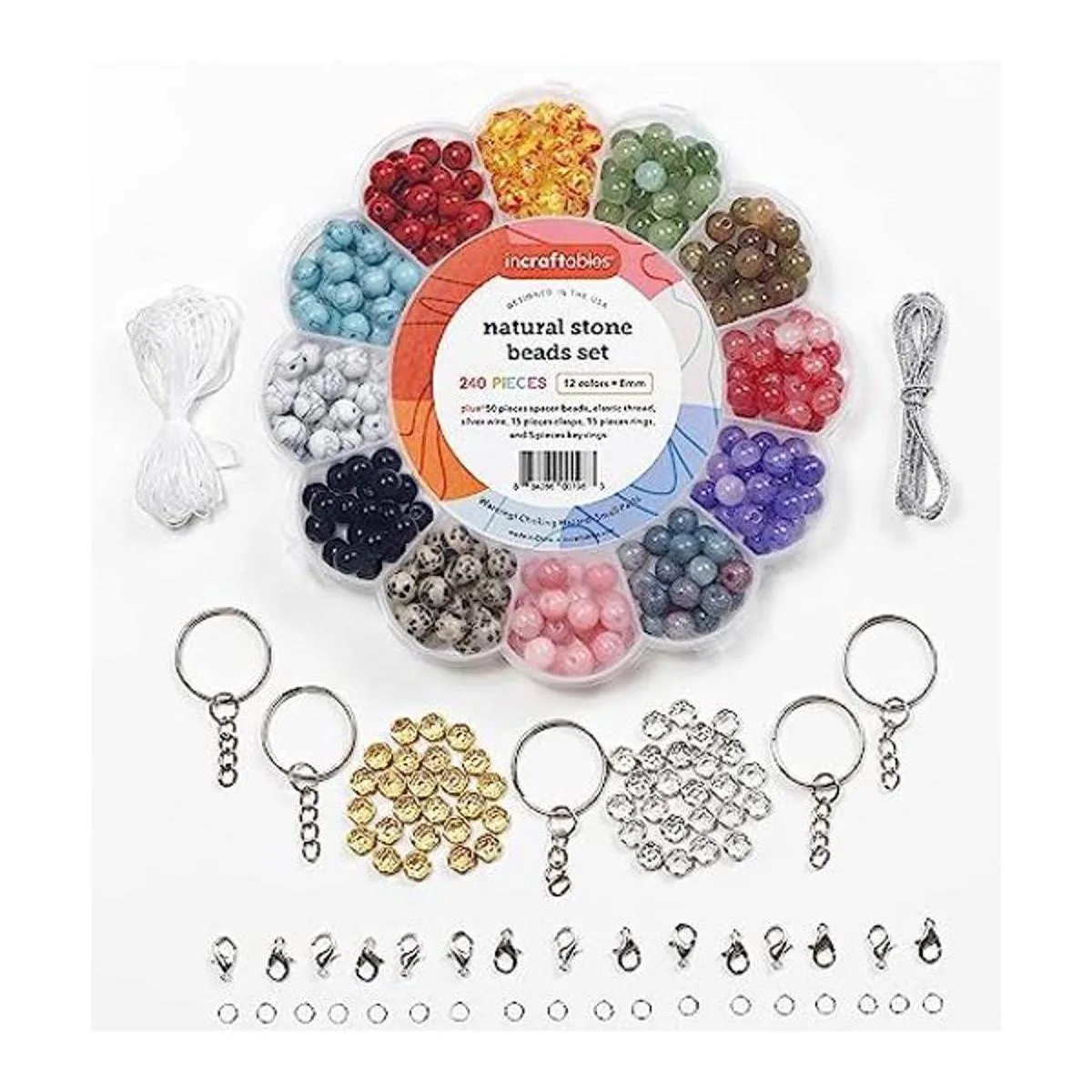 Paquete económico: cada paquete a granel incluye 240 cuentas de piedra natural de 0.315 in de 12 colores 20 piezas de cada color más 150 piezas de 6 tipos de cuentas espaciadoras oro y plata. Este juego también incluye cuerda elástica, alambre plateado, 15 llaveros, 15 cierres, 15 anillos de salto y caja organizadora,