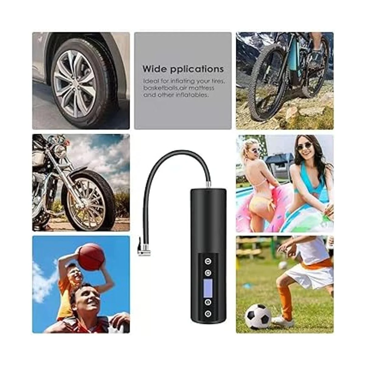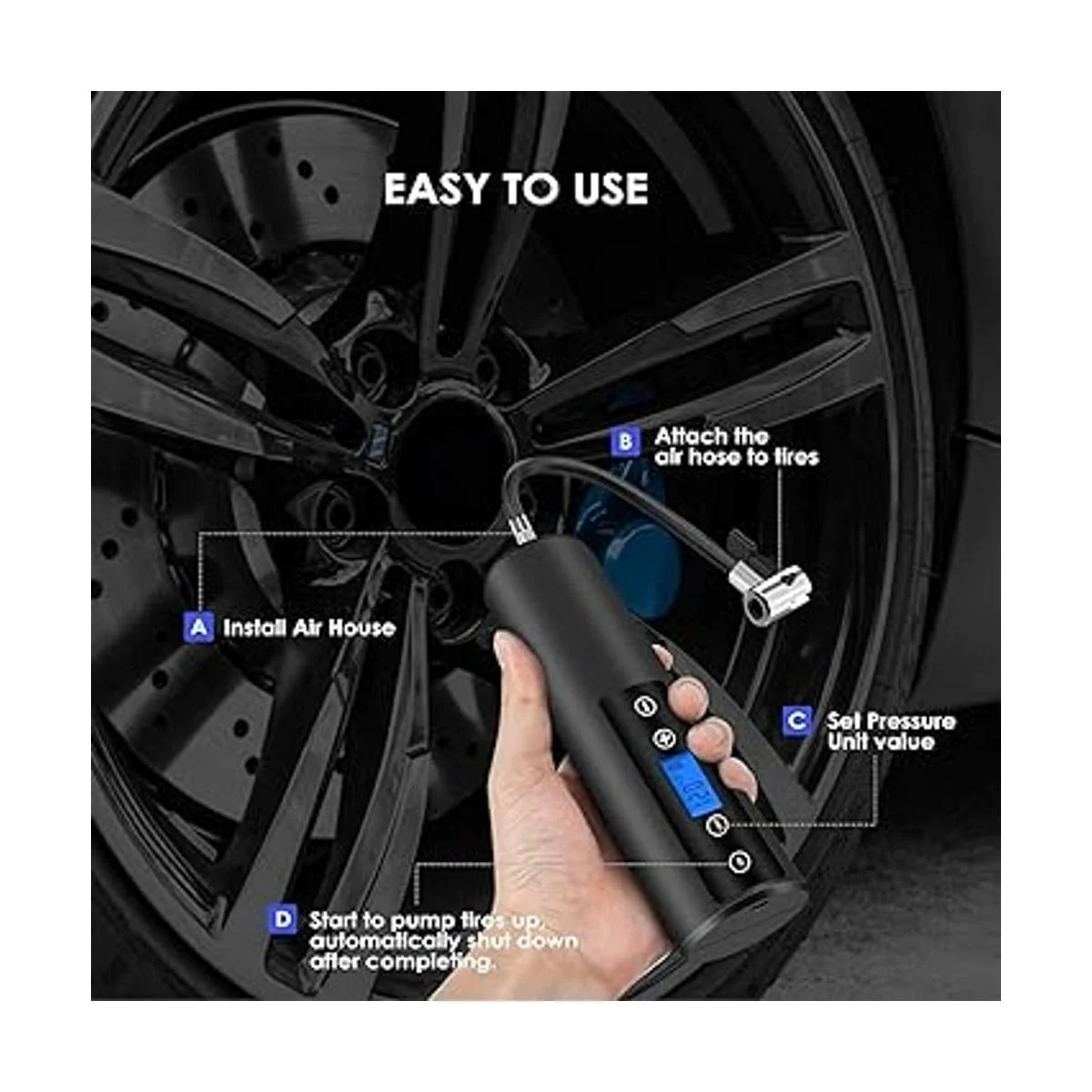 Alta eficiencia de inflado: esta bomba incluye los accesorios metálicos necesarios para poder inflar una rueda de auto en menos de 5 minutos. La presión máxima de inflado es de 120 PSI, la cual es apta para autos, bicicletas, motocicletas, pelotas hinchables, flotadores, colchones de aire, juguetes inflables, etc.