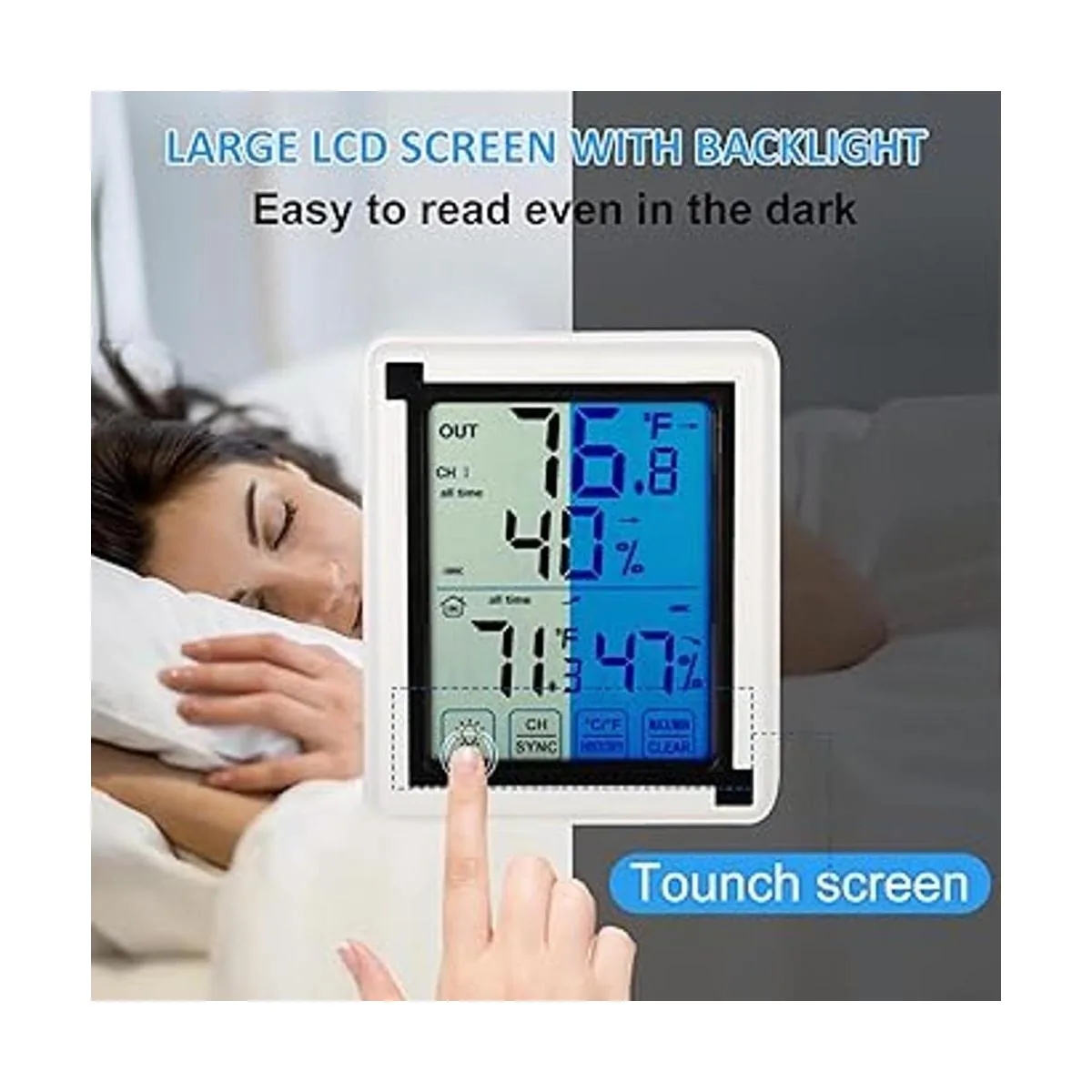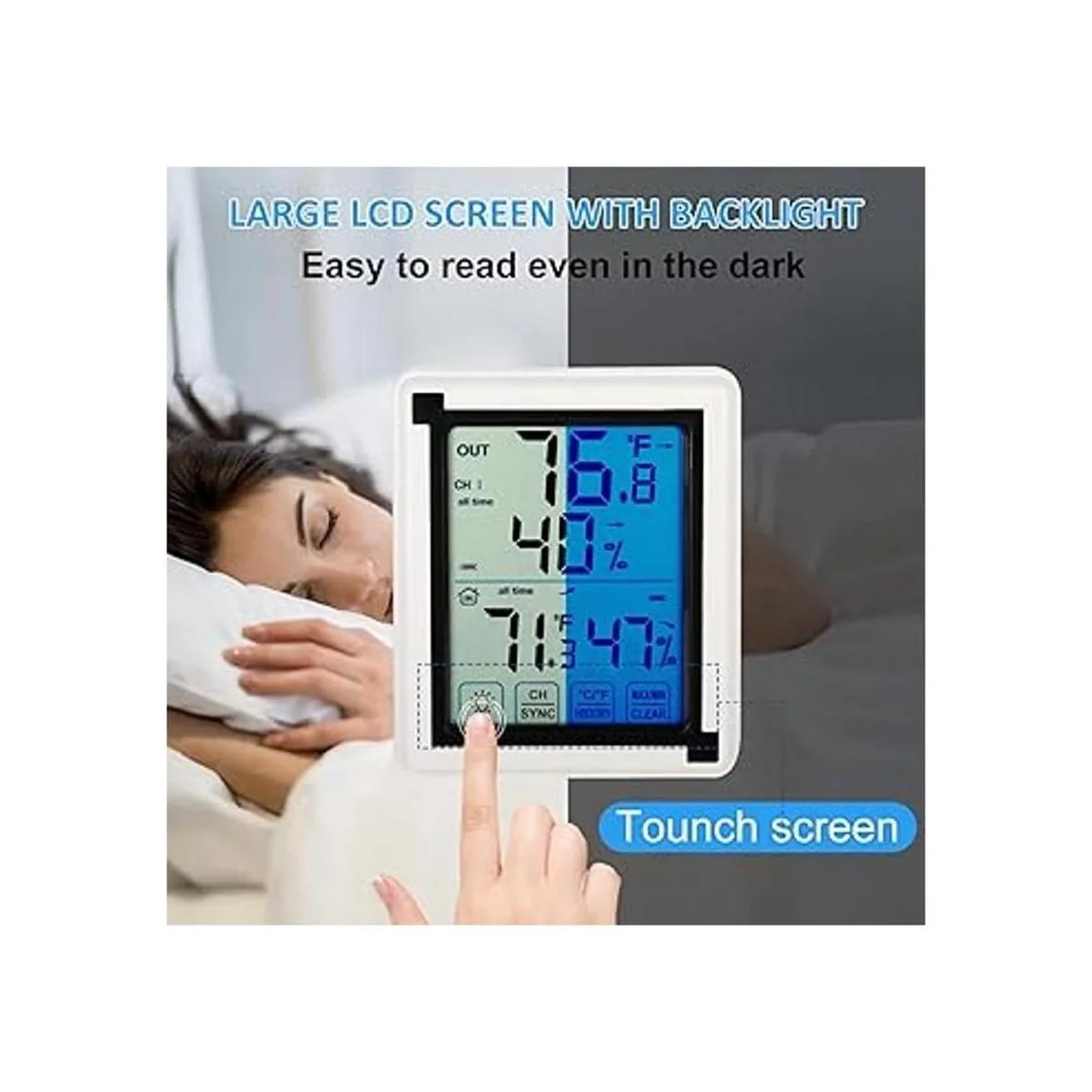 Retroiluminación y pantalla táctil: el termómetro e higrómetro inalámbrico Inhuhoo cuenta con retroiluminación azul y pantalla táctil, enciende la retroiluminación para que sea claro y fácil de leer por la noche, apagado automático de 10 segundos.