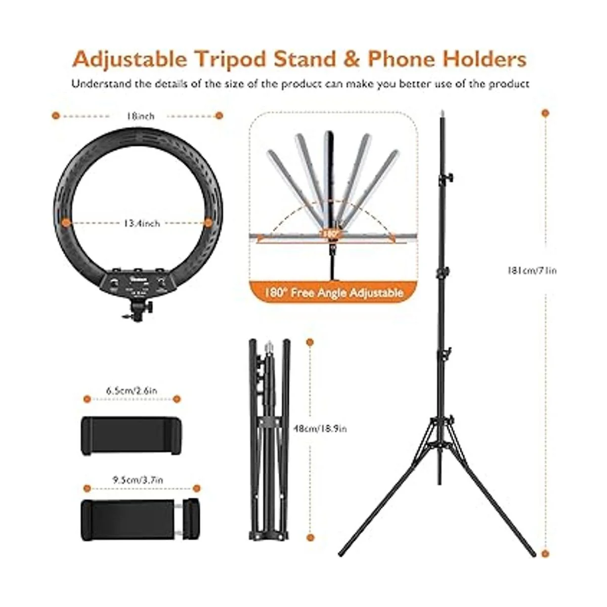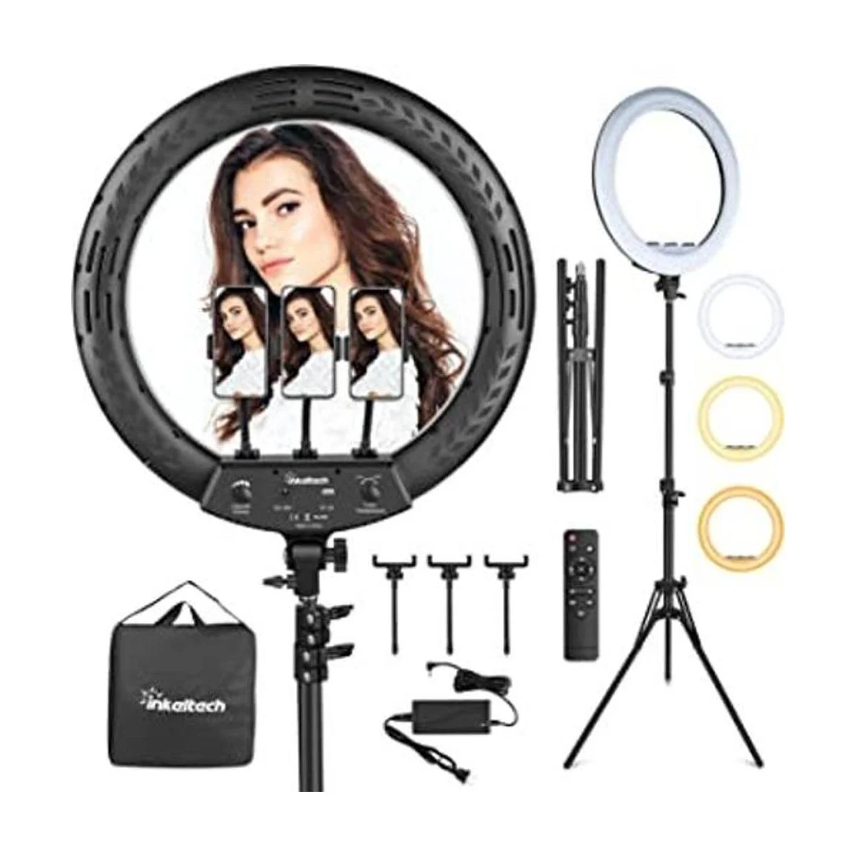 Inkeltech Anillo de luz de 18 pulgadas con soporte para trípode y 3 soportes para teléfono, kit de luz de anillo LED regulable, anillo de luz de temperatura de color ajustable de 2700 K6500 K para transmisión en vivo, video de tubo, TikTok, maquillaje