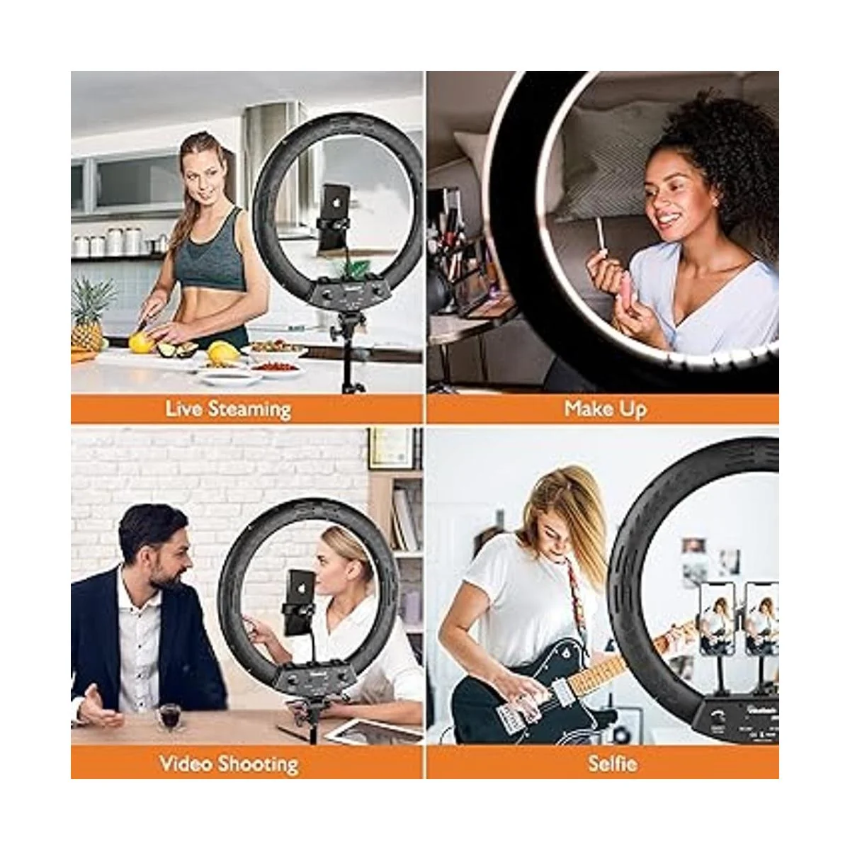 Soporte flexible para teléfono y puerto de carga USB: cada kit de luz de anillo INKELTECH tiene 3 soportes de teléfono de 360 grados que te ayudan a capturar sin esfuerzo diferentes niveles de brillo y ángulos de iluminación El soporte para teléfono es adecuado para la mayoría de teléfonos inteligentes, incluyendo iPhone, Samsung y Huawei. INKELTECH Ring Light resolvió el problema de que tu teléfono está fuera de energía cuando estás transmitiendo en vivo. Puedes cargar tu teléfono a través del puerto USB en la parte posterior del anillo mientras estás tomando videos.