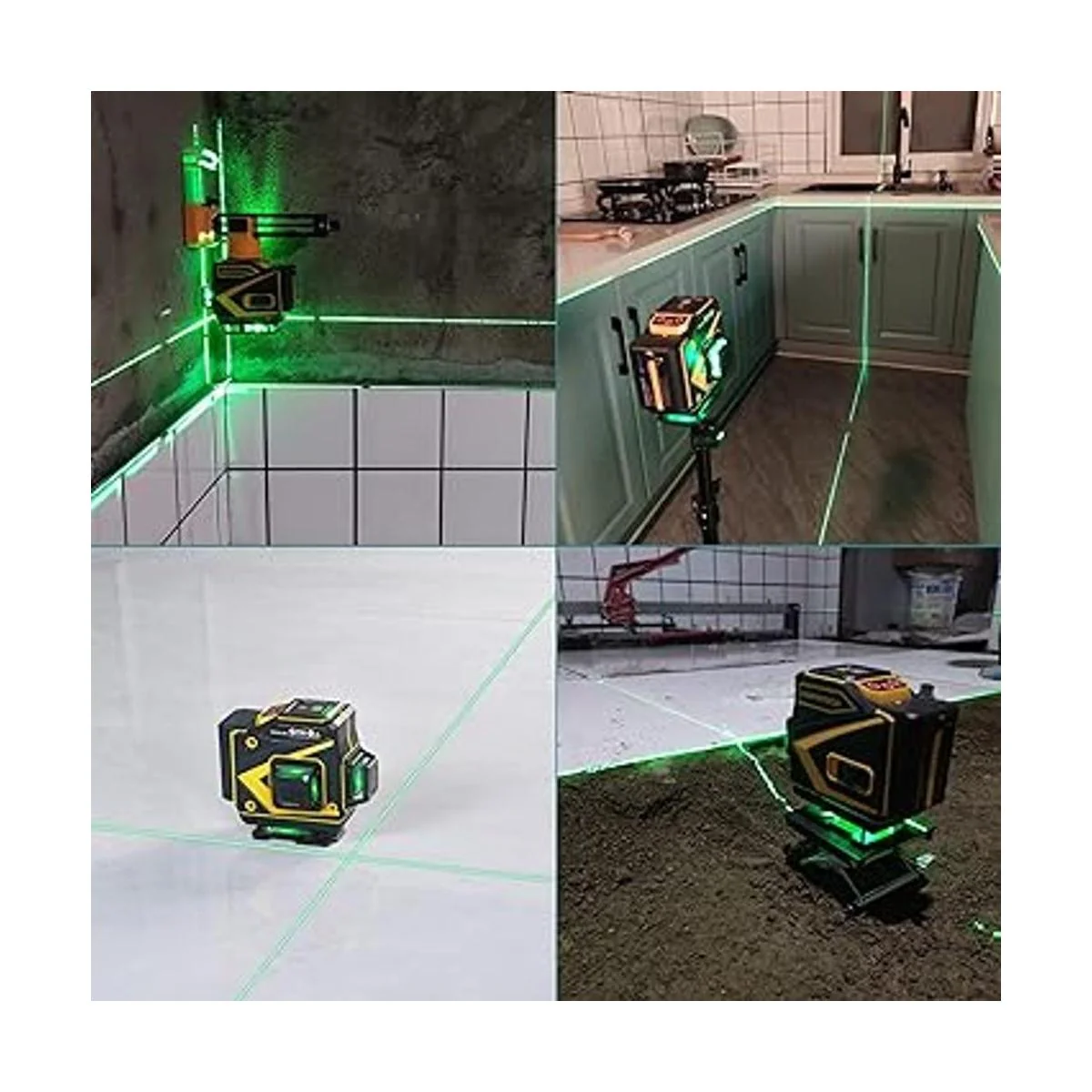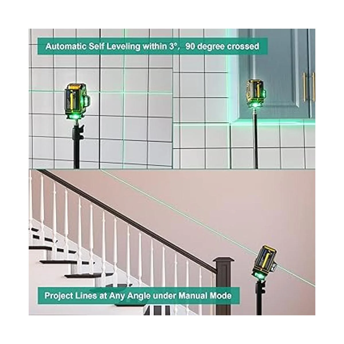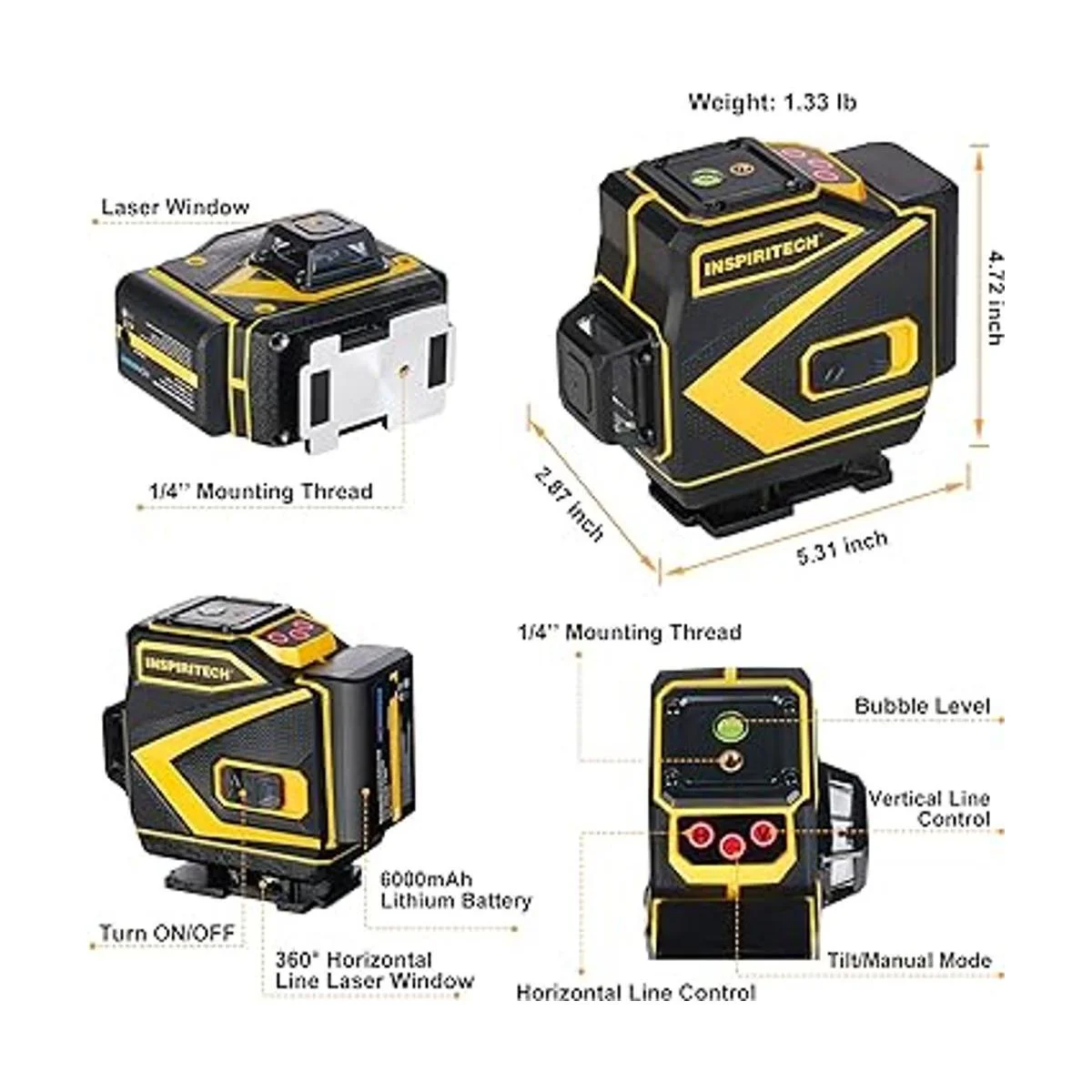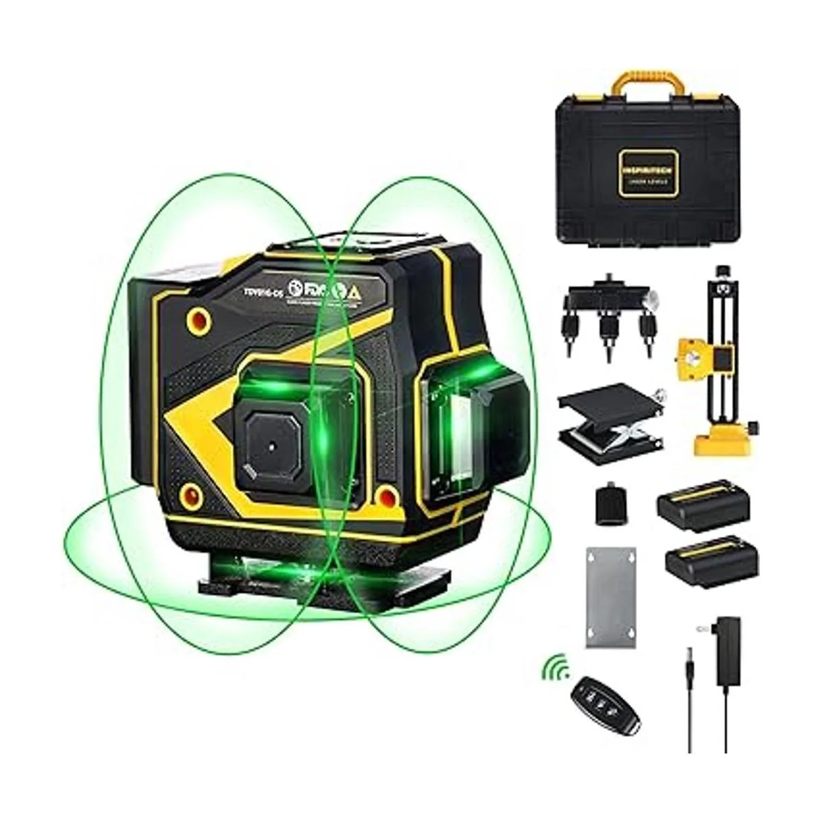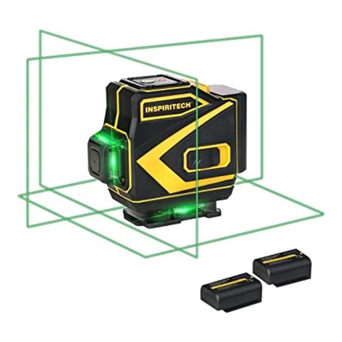 INSPIRITECH Guía de alineación 3D autonivelante de nivel láser, 3 x 360 , vertical horizontal de 12 líneas cruzadas, herramienta niveladora lazer de haz verde para piso techo de pared con 2 baterías de litio