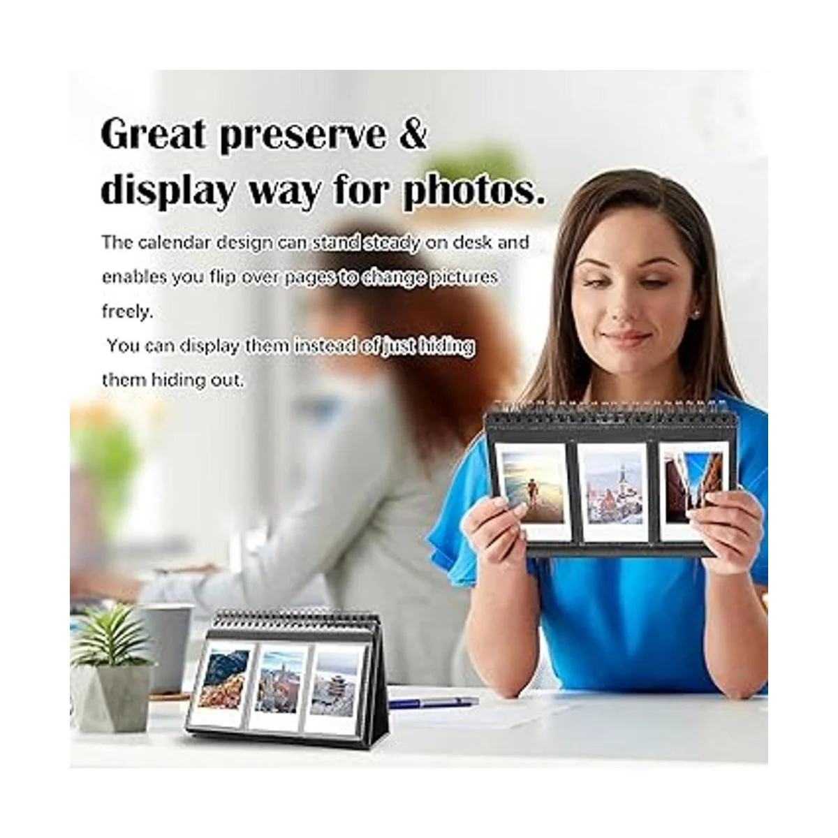 Ideal para exhibir Cuando está abierto, el álbum de calendario de escritorio mide 3.5 pulgadas de ancho, 5.1 pulgadas de alto. Bueno en mesa, escritorio, mostrador o repisa, tiene un amplio espacio para citas. Puedes utilizar el álbum de calendario de escritorio para guardar y mostrar fotos, se mantiene de pie y muestra fotos en ambos lados, con la capacidad de voltear fácilmente a través de ellas.