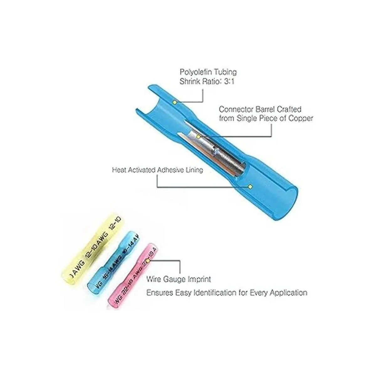 Múltiples opciones e identificación: nuestros conectores termorretráctiles están disponibles en varios tamaños de color AWG2622, AWG2218, AWG1614, AWG1210. Con marcas de calibre de alambre fácilmente identificables. Simplemente mide el cableado, y comprobando las marcas de calibre de alambre en el tubo de poliolefina, puedes seleccionar rápidamente el conector adecuado.
