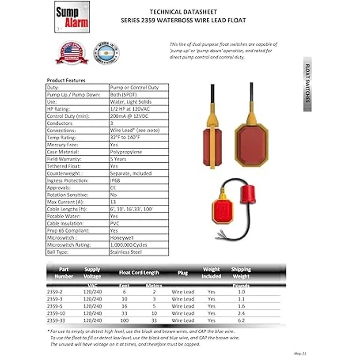 La carcasa no corrosiva del flotador Water Boss para tanques de agua y bombas de sentina tiene clasificación IP68. La construcción de polipropileno resistente también hace que este interruptor de nivel de agua sea resistente a la temperatura de 32 F a 140 F.
