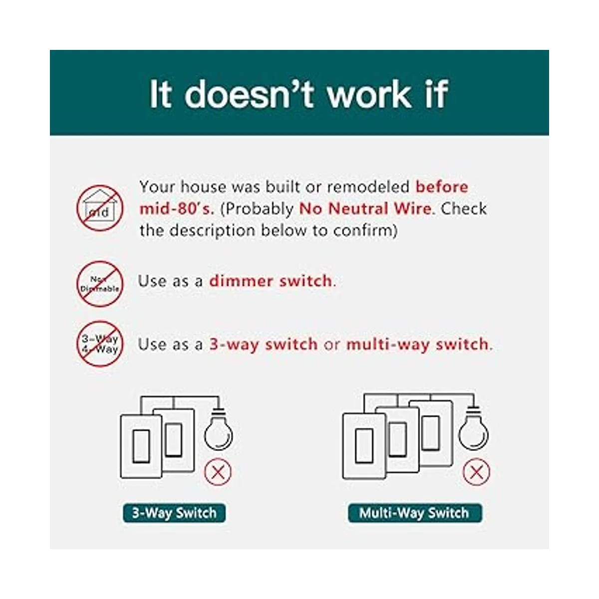 Fácil y seguro de instalar: se requiere cable neutro; solo para WiFi de 2.4 G no 5 G. Las instrucciones paso a paso te guiarán a través del proceso de cableado. Tamaño estándar; placa de pared sin tornillos, no requiere buje. Potencia máxima: 1250 W. Corriente de salida: 10 A. Certificado FCC.
