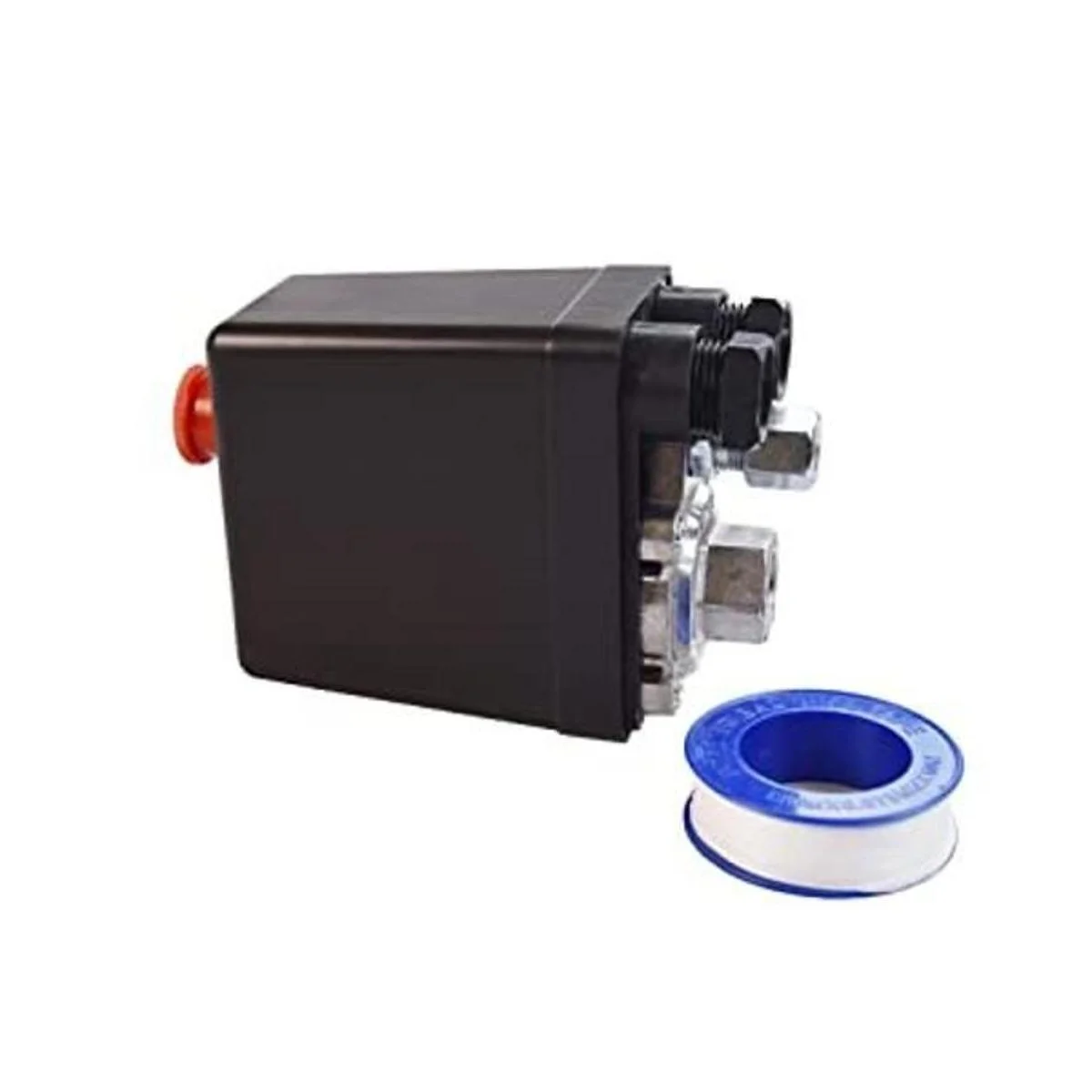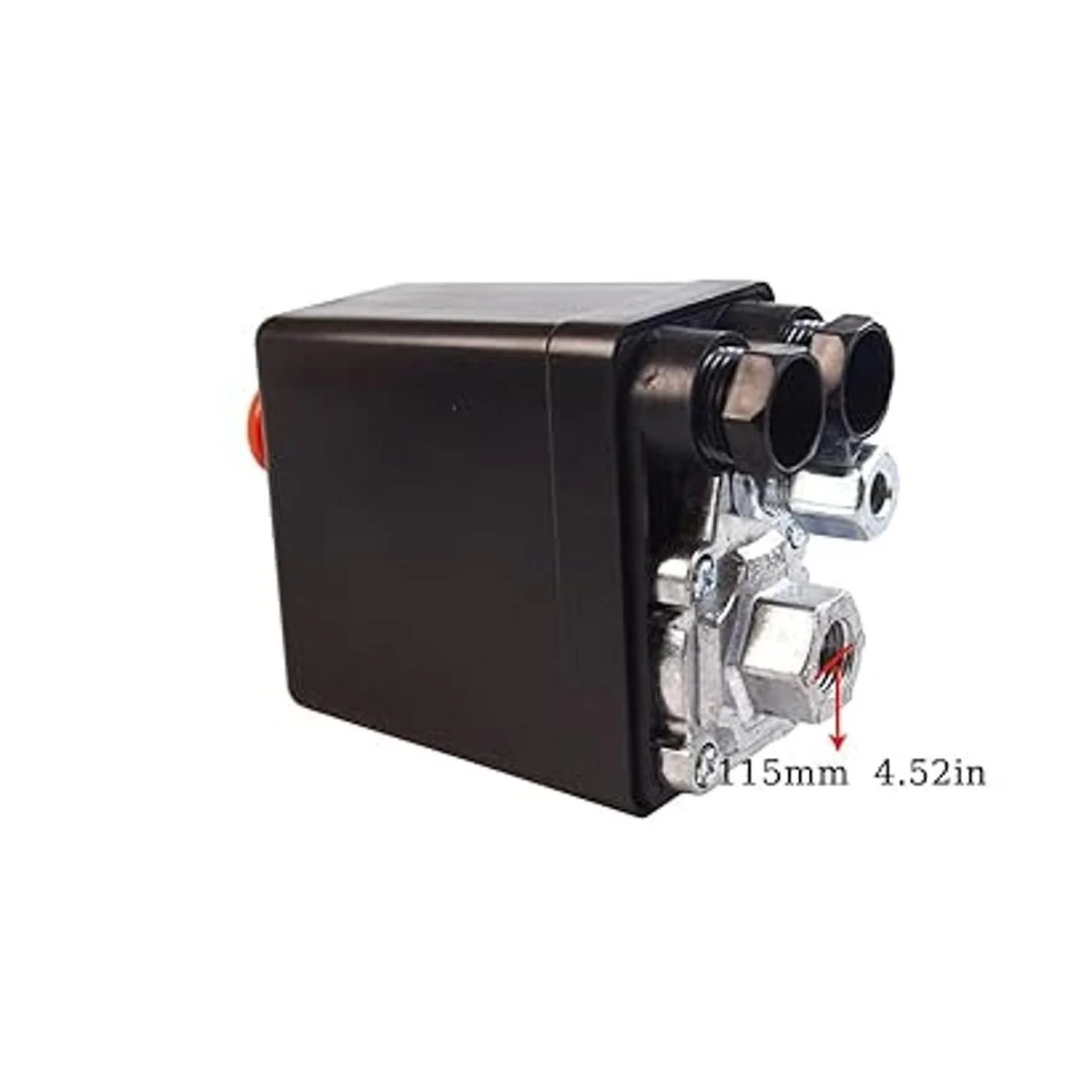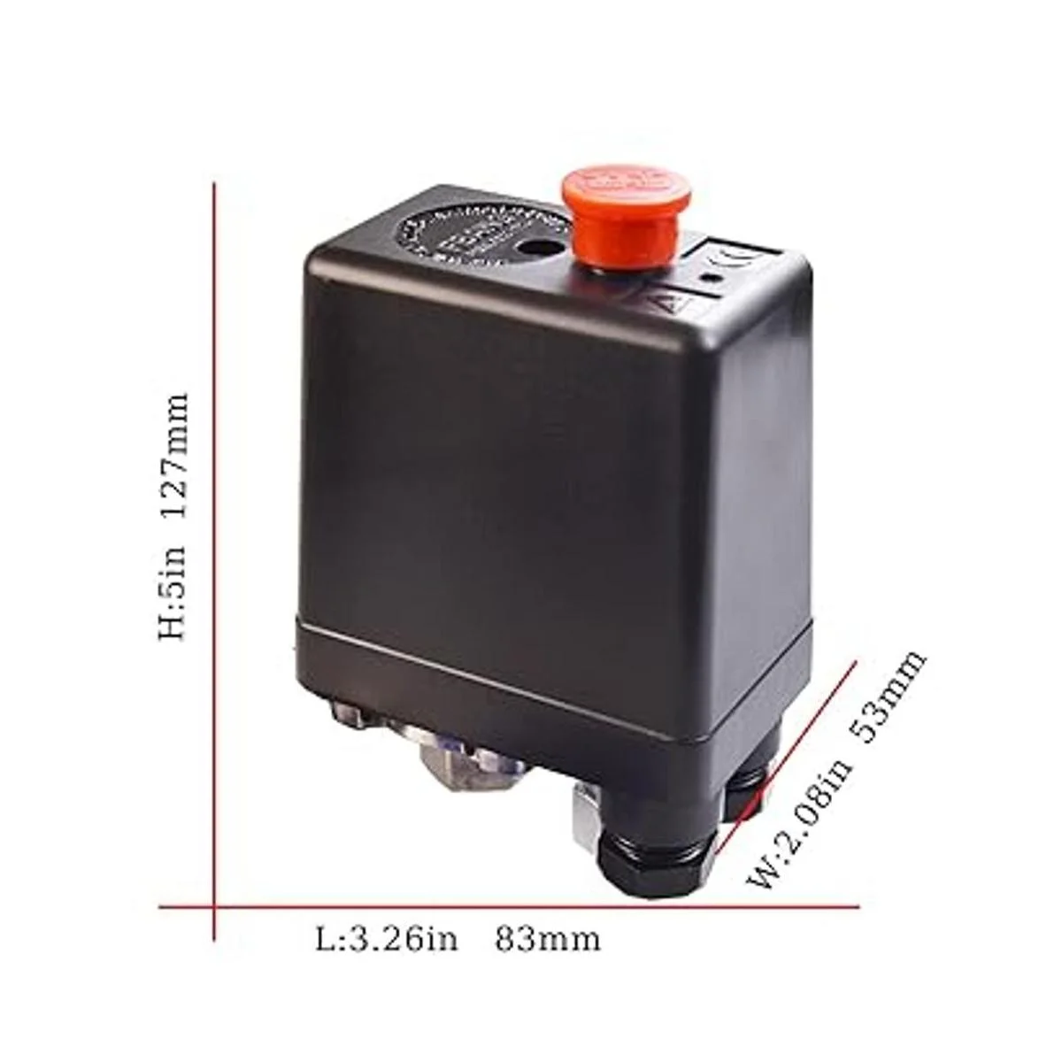Interruptor de presión del compresor: plástico duro duradero y metal. Modelo: interruptor de cuatro puertos: 4.8 x 3.2 x 2 pulgadas largo x ancho x grosor. Hay una perilla de interruptor de encendido/apagado roja para control automático. Funcionamiento sencillo, fácil de instalar y usar.