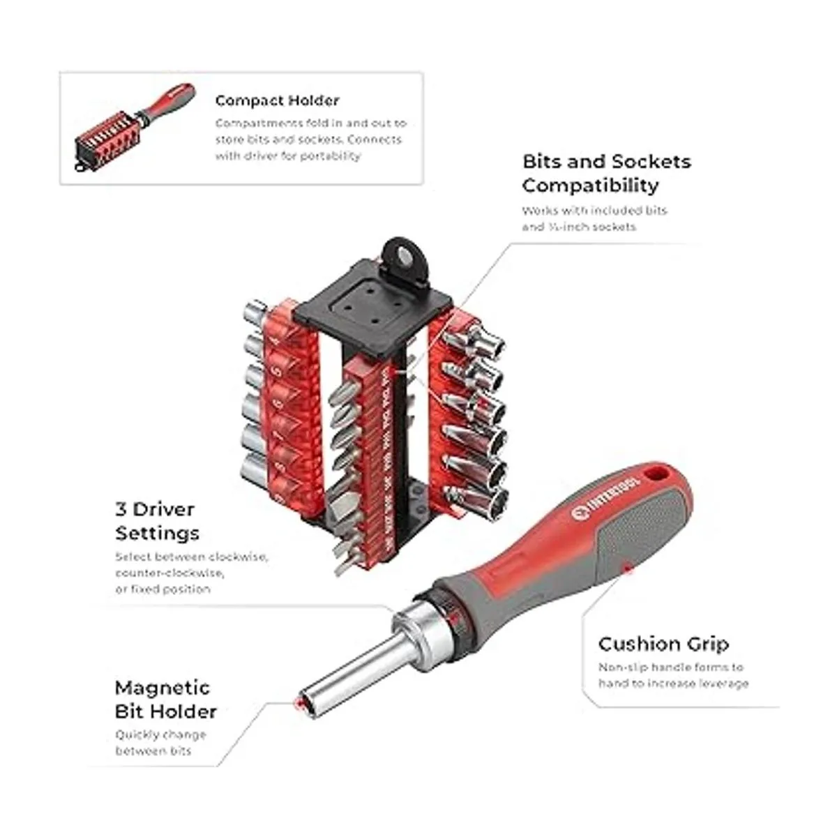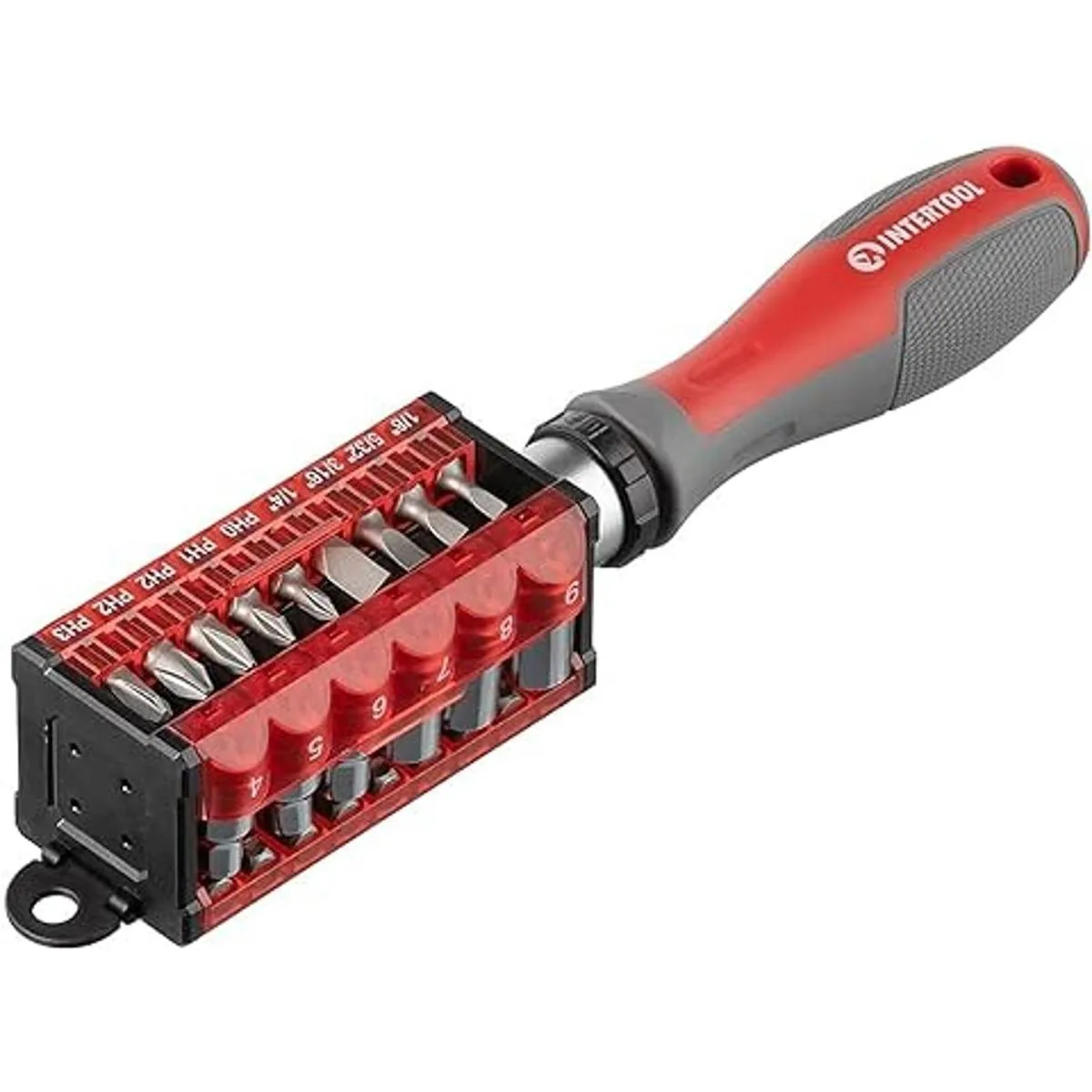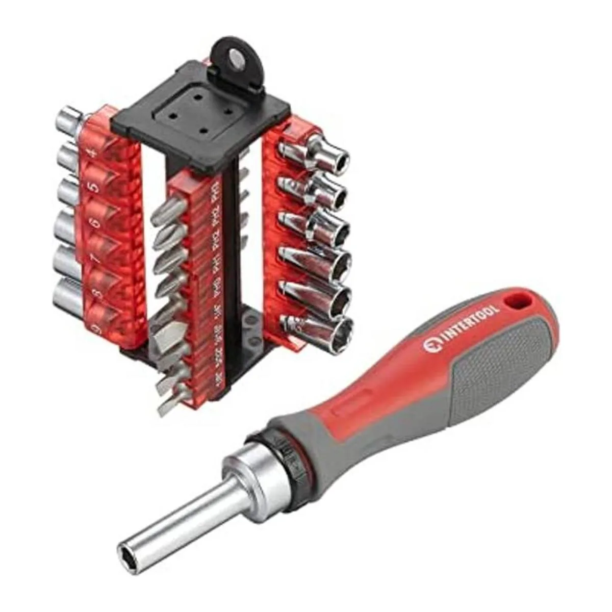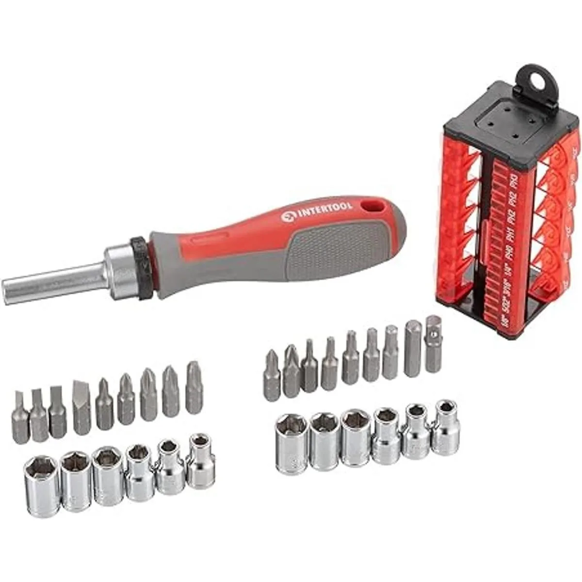 INTERTOOL Destornillador de trinquete de 31 piezas, destornillador multibroca, juego de puntas y enchufes, estuche de almacenamiento compacto acoplable VT083374