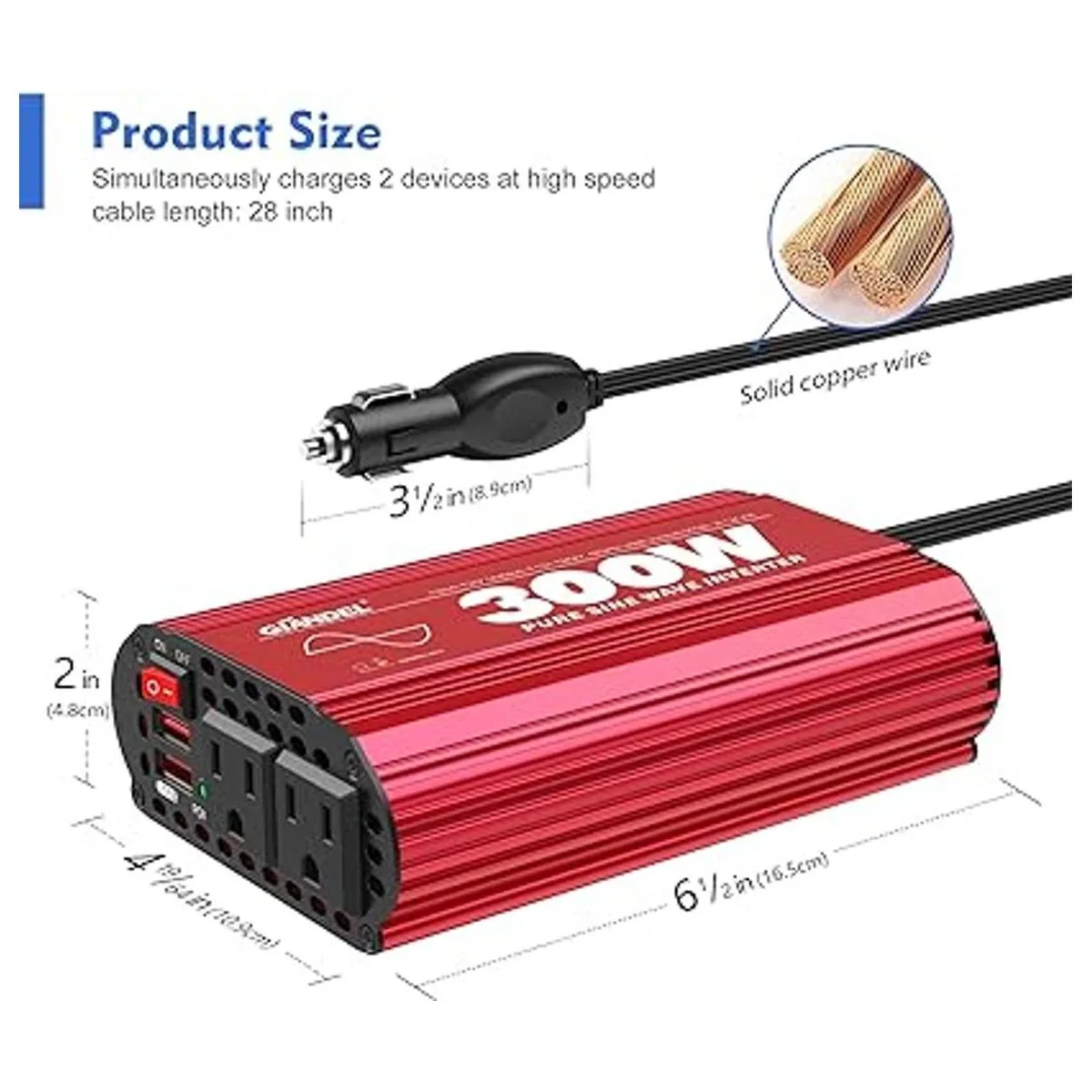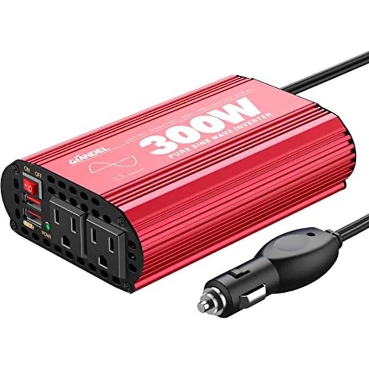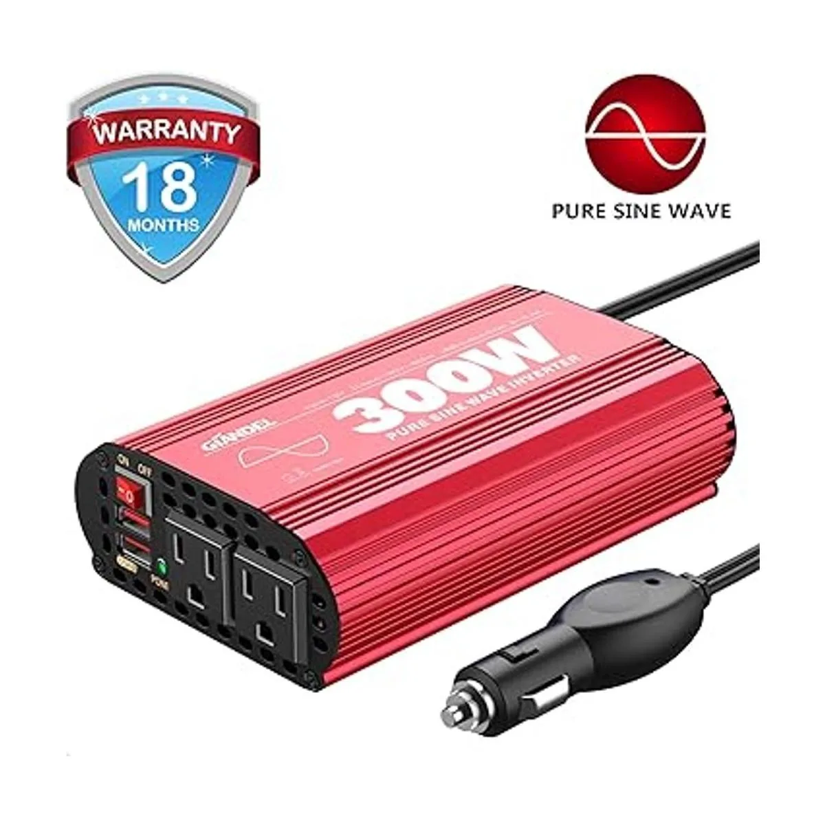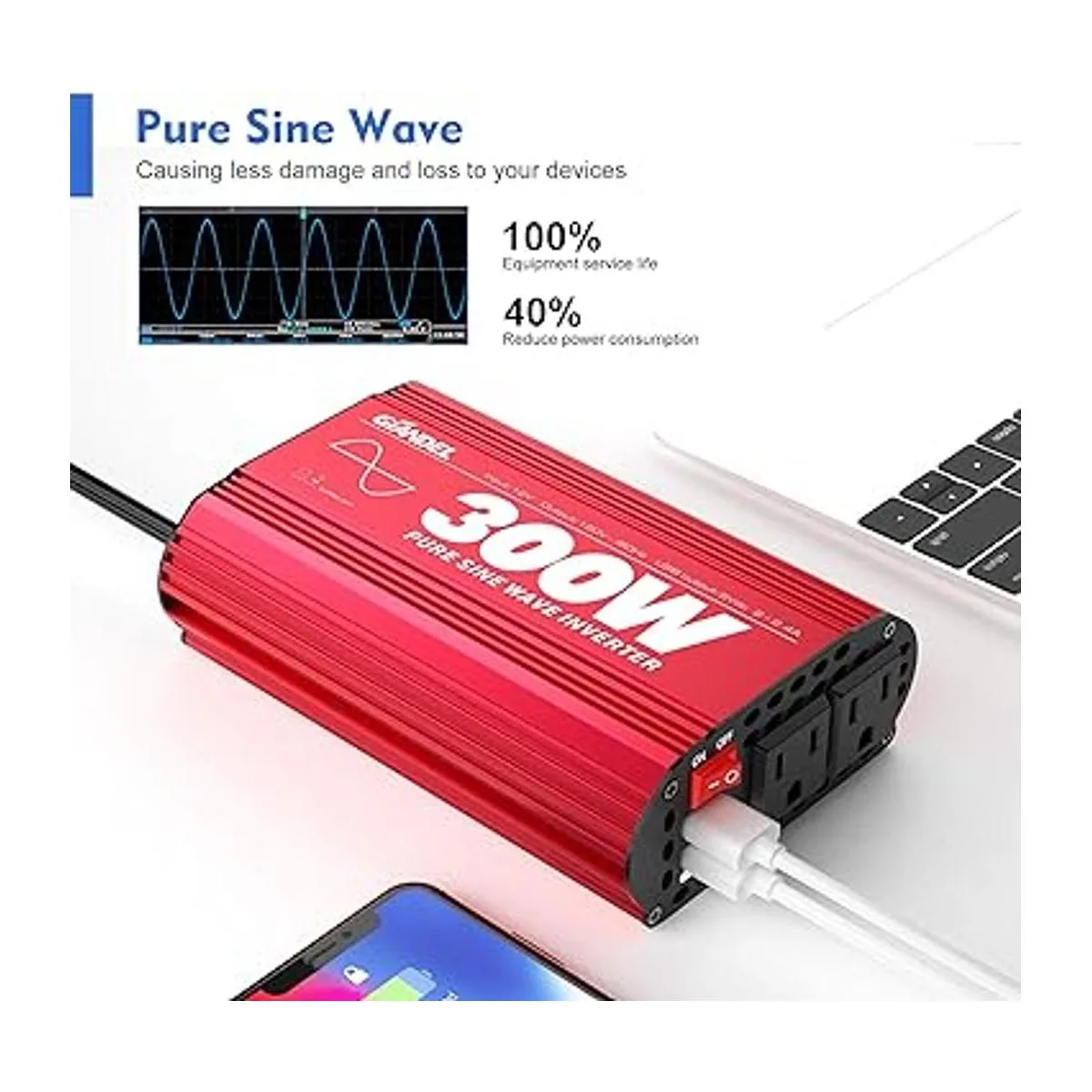 GIANDEL Inversores sinusoidal puro de 300 W diseñados para tus dispositivos que requieren una protección cuidadosa, proporcionan alimentación continua de CC a CA de 300 W en el coche y con 2 salidas de CA y 2 puertos de carga USB, ideal para regalo de Navidad, luces de cadena de carga, laptop, altavoces, cámaras, nebulizador, consola de juegos, Kindle, iPad y otros