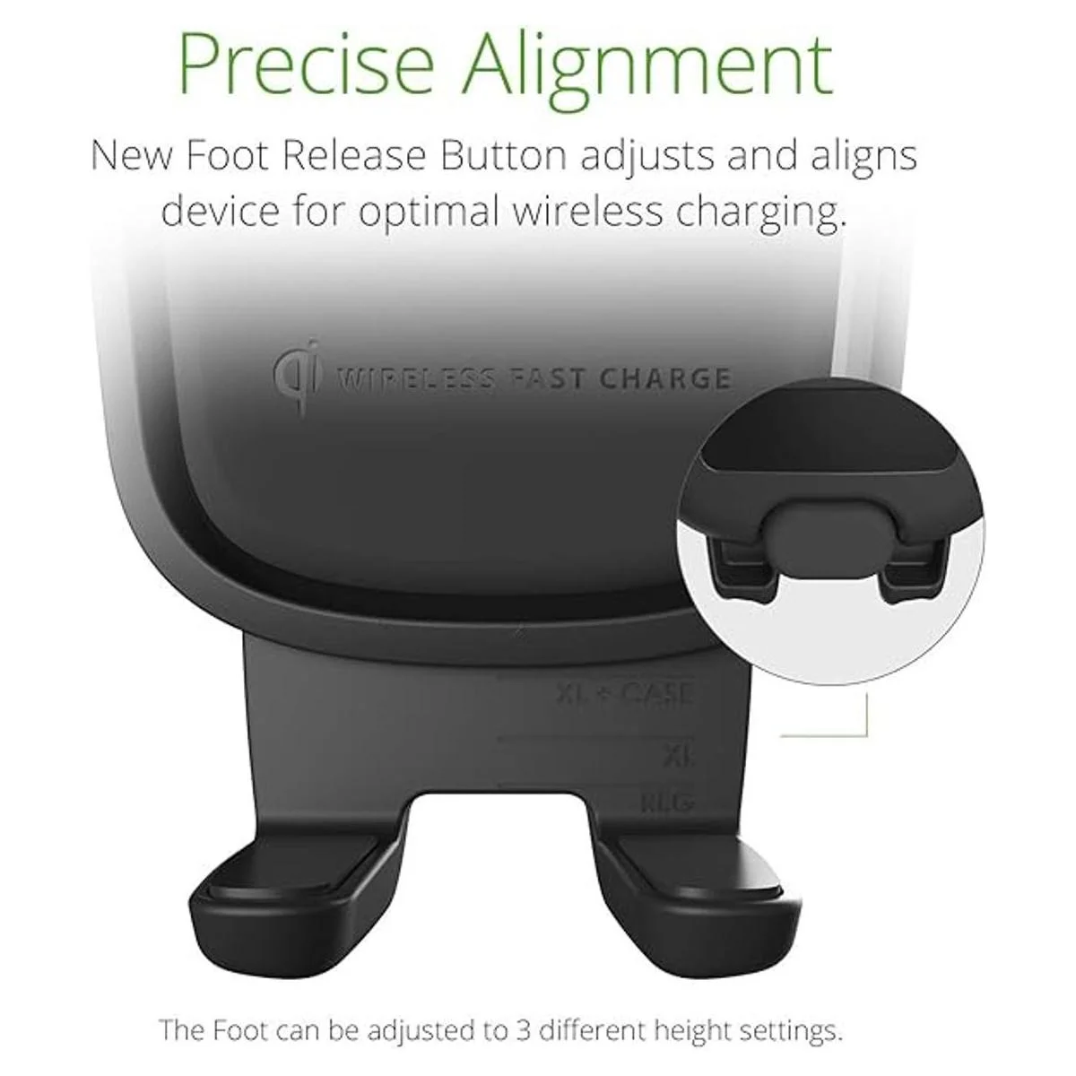 Nuevo pie ajustable con un botón que se puede ajustar para alinear el dispositivo para carga inalámbrica y se ajusta para adaptarse a smartphones grandes y extragrandes de hasta 3.7 pulgadas