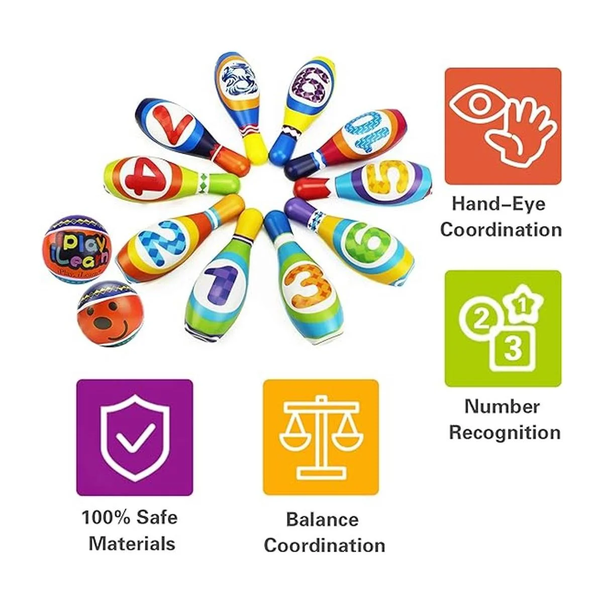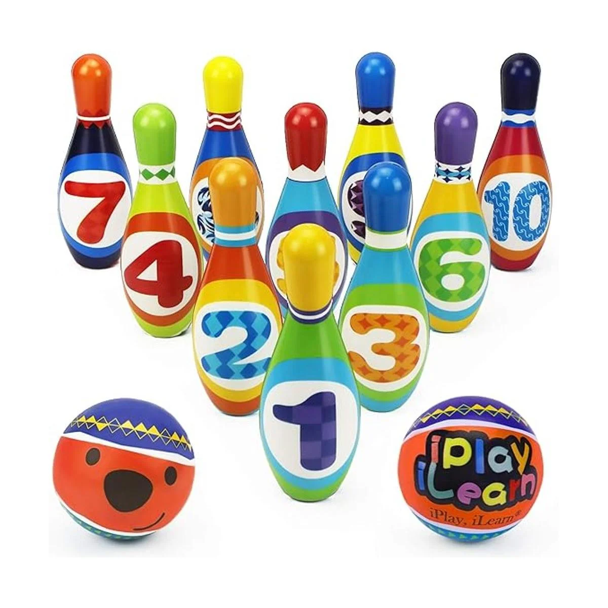 iPlay, iLearn Juego de juguetes de bolos para niños, juego de actividades para interiores y exteriores, suave juego de 10 pines de espuma y dos bolas, regalo educativo de fiesta de cumpleaños para niños de 18 a 24 meses, niños y niñas de 2 a 3 años