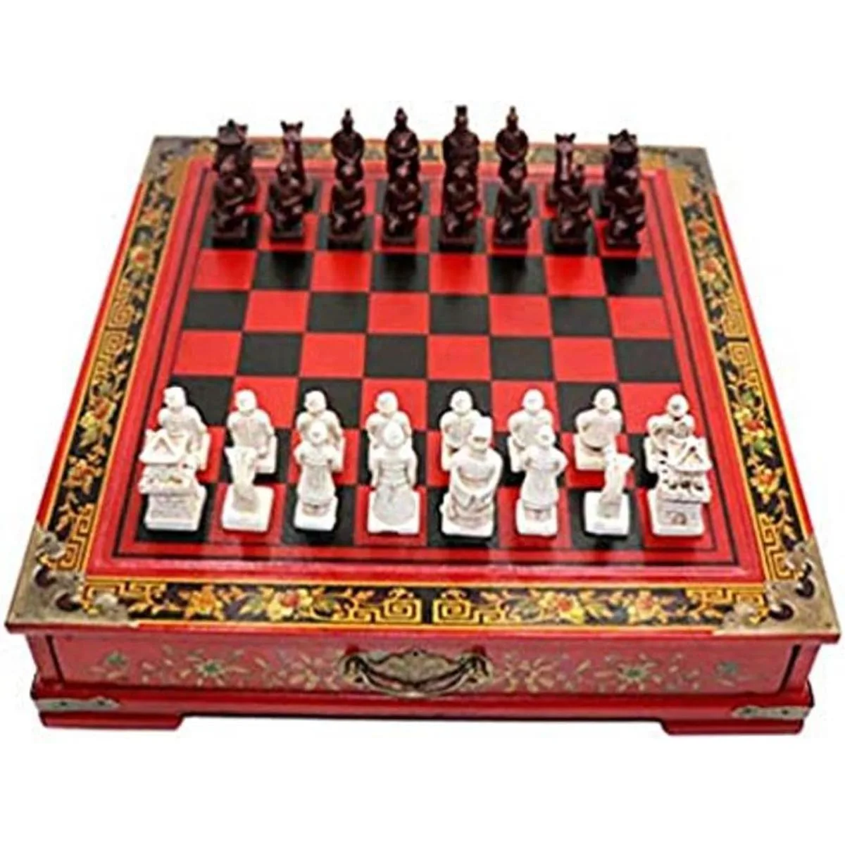 Ireav Juego de ajedrez retro de guerreros terracota para niños y adultos, clásico juego de mesa familiar con tablero plegable de madera, piezas de resina en 3D y ranuras para su almacenamiento 26 26 cm