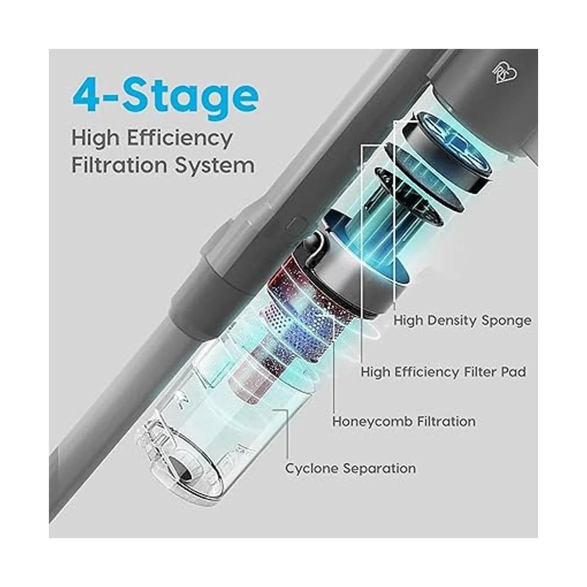 Limpieza de alta potencia: la aspiradora inalámbrica IRIS USA tiene un amplio camino de limpieza para recoger migas, polvo, pelo de mascotas, caspa y otros residuos. El sistema de separación centrífuga de 2 etapas utiliza succión ciclónica avanzada para dividir partículas pequeñas y grandes, mientras mantiene la potencia de succión al 99 más. El rodillo de cepillo de cabezal eléctrico solo modelo P gira hasta 6.000 RPM para un potente rendimiento de limpieza inalámbrica. El motor principal gira hasta 60.000 RPM en el modo alto.