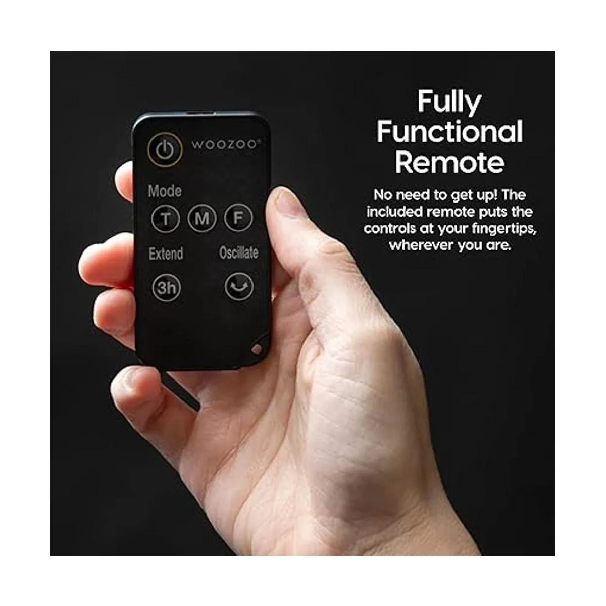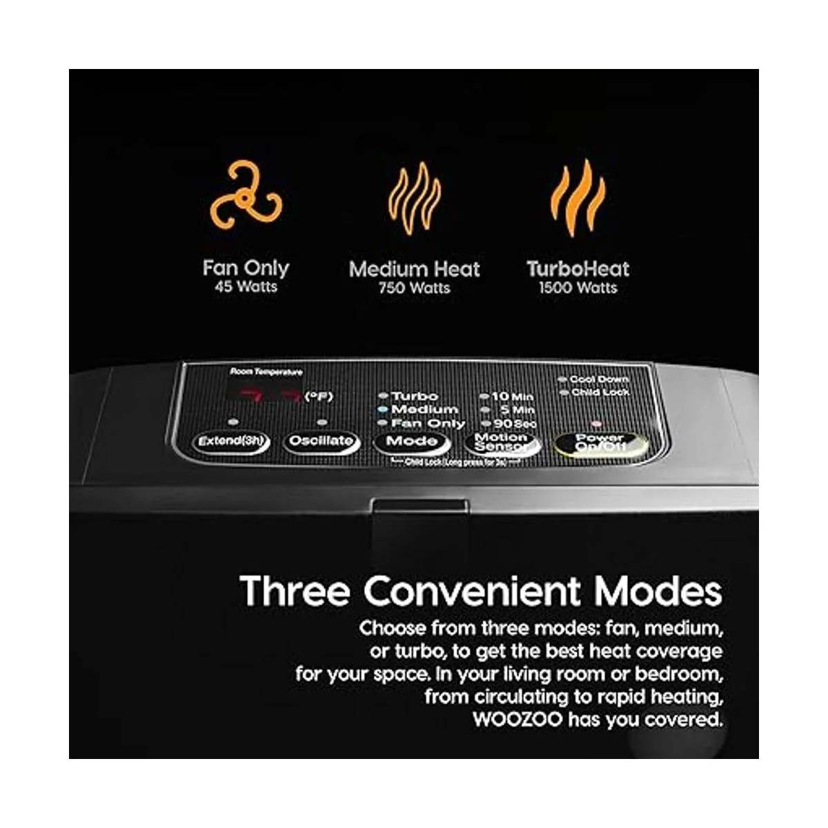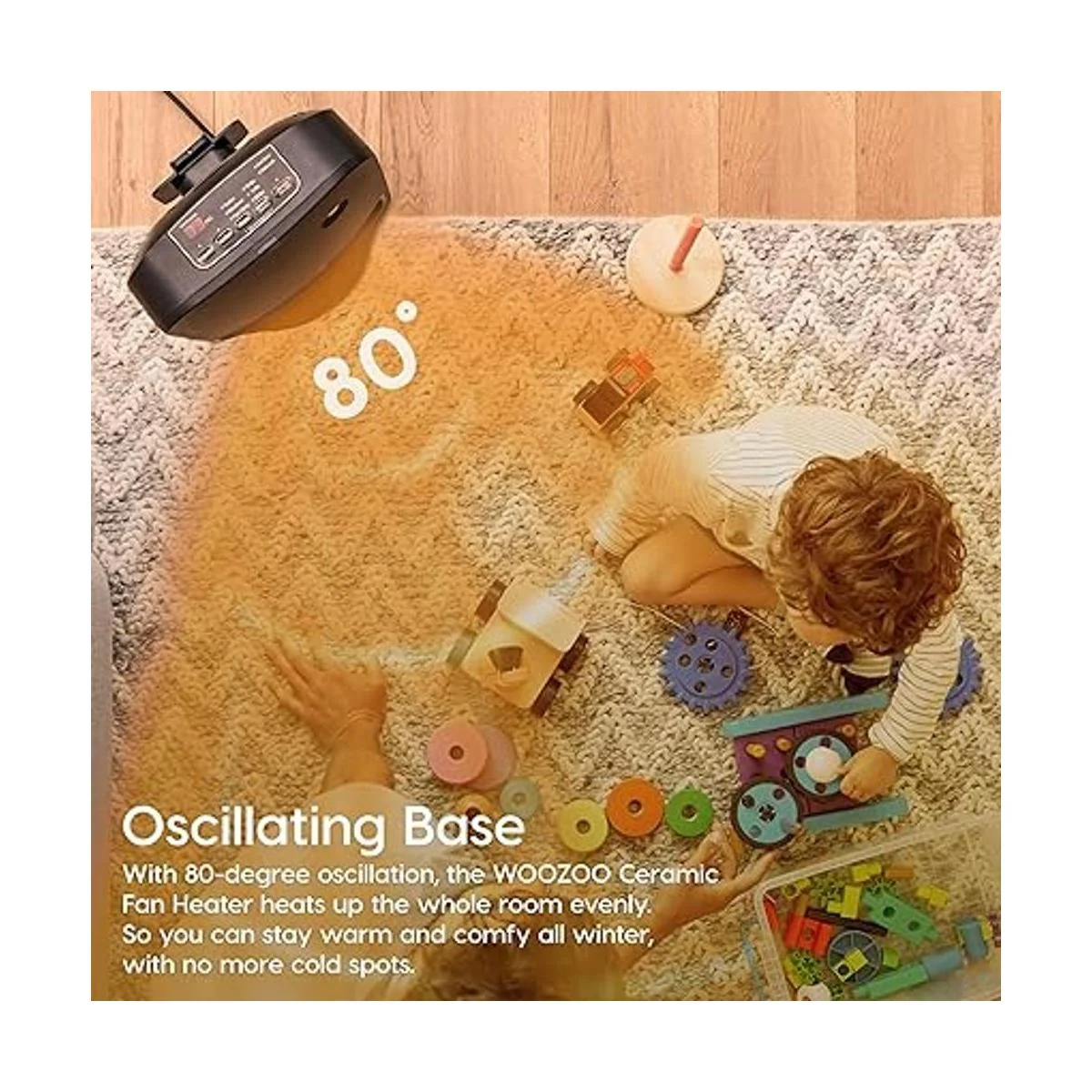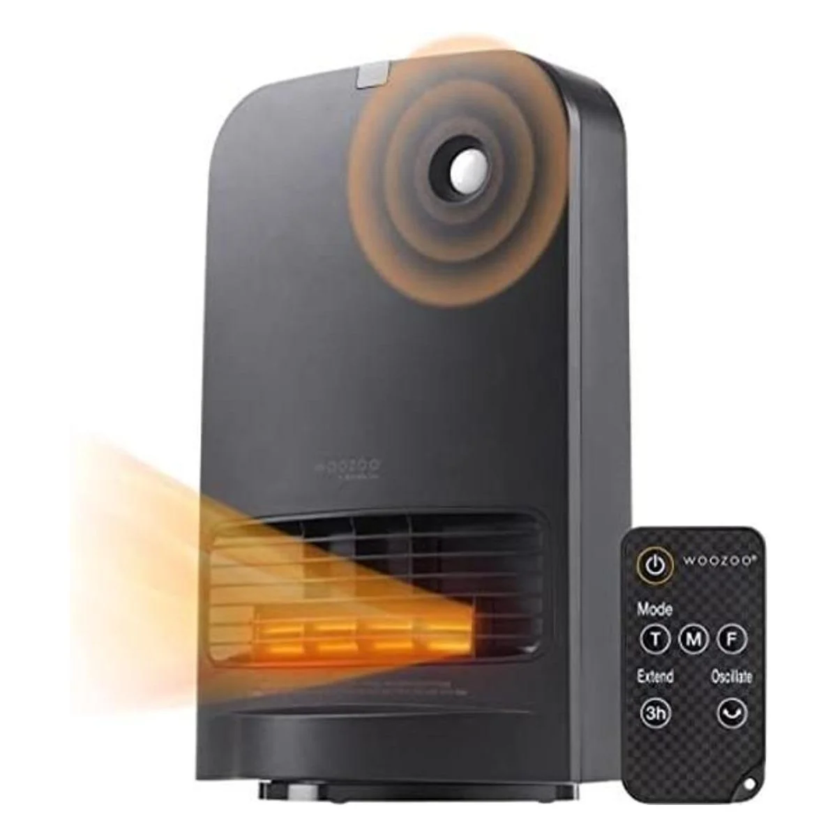 IRIS USA WOOZOO Calentador portátil oscilante de 1500 W con sensor de movimiento, ventilador de cerámica espacial para escritorio, calefacción rápida en interiores, habitación interior, calentador personal seguro para niños con termómetro integrado, color negro