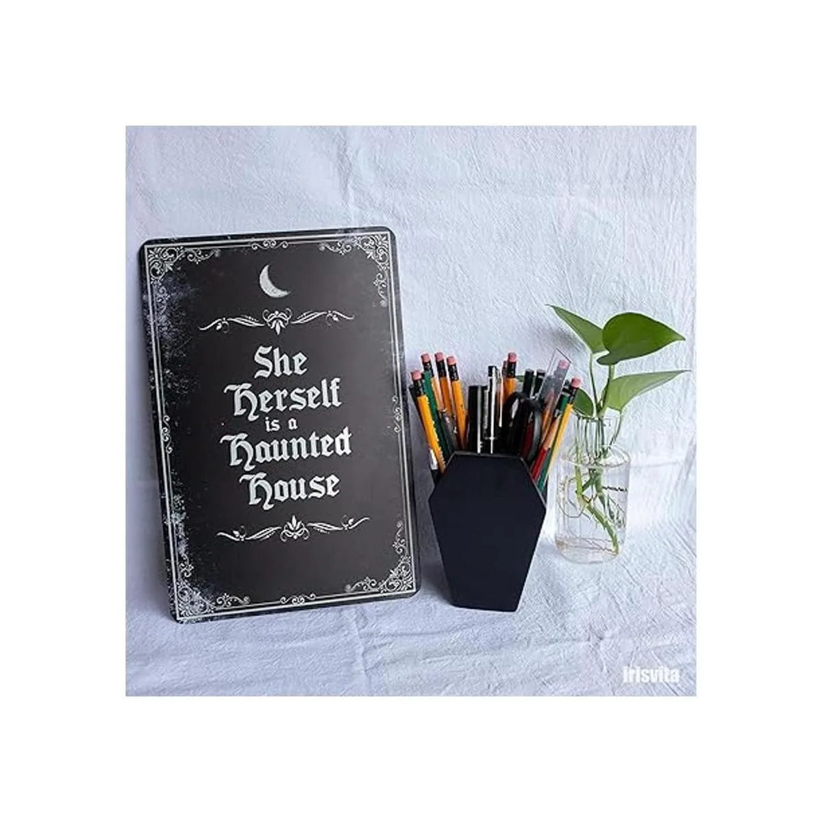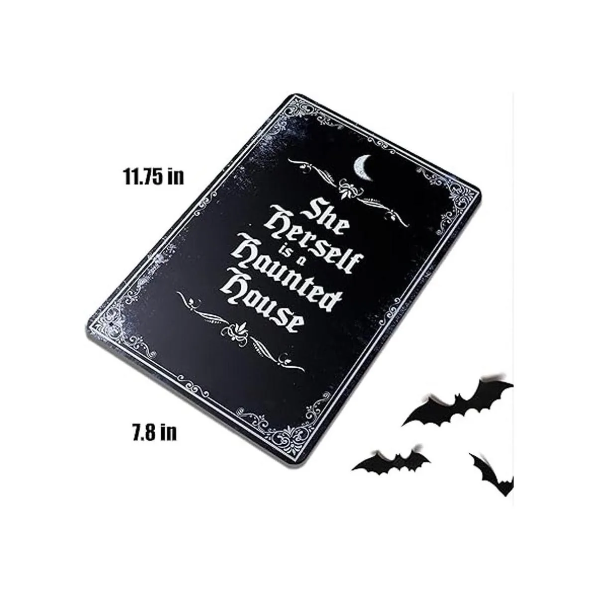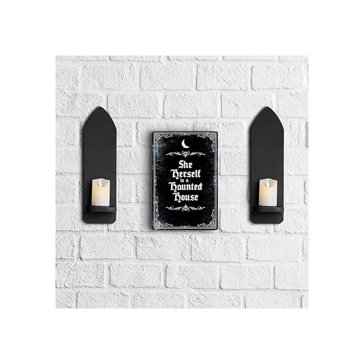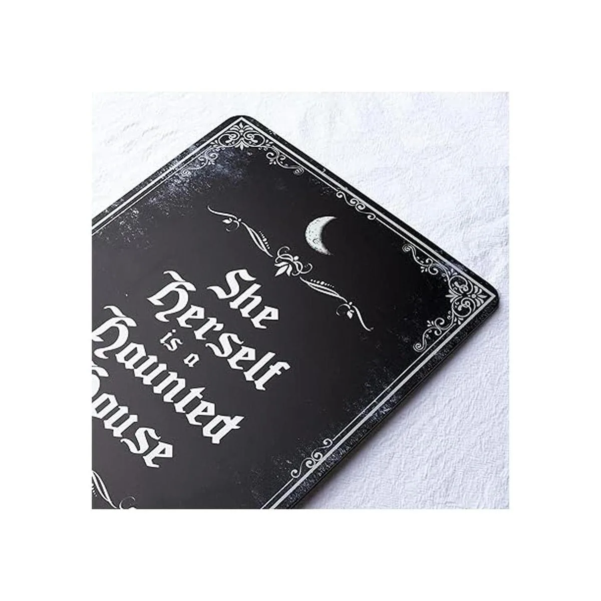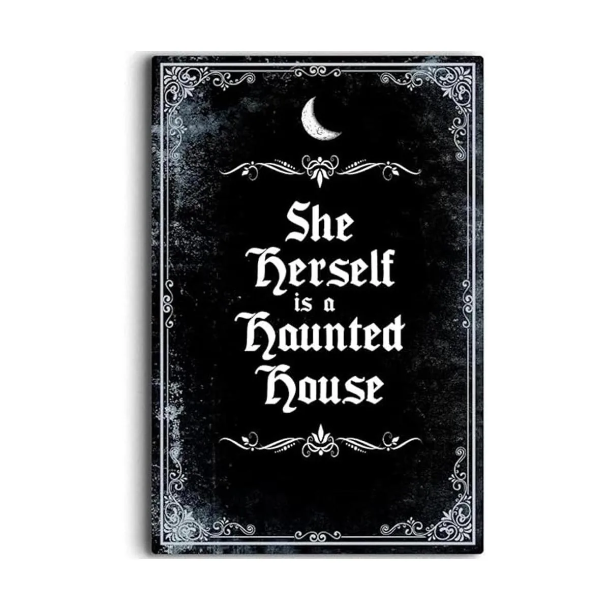 IRISIVITA Letrero de metal espeluznante, She Herself Is A Haunted House, decoración gótica para dormitorio, decoraciones vintage de Halloween para interiores, decoración de habitación de brujas, decoración de habitación gótica, decoración de Halloween, 11.75 x 7.8 pulgadas