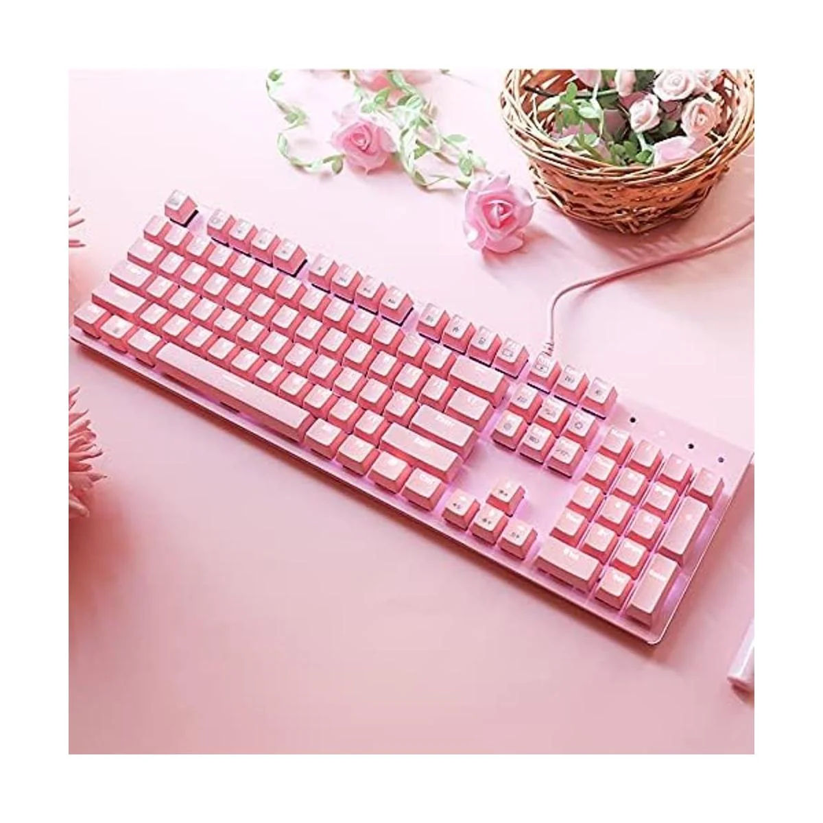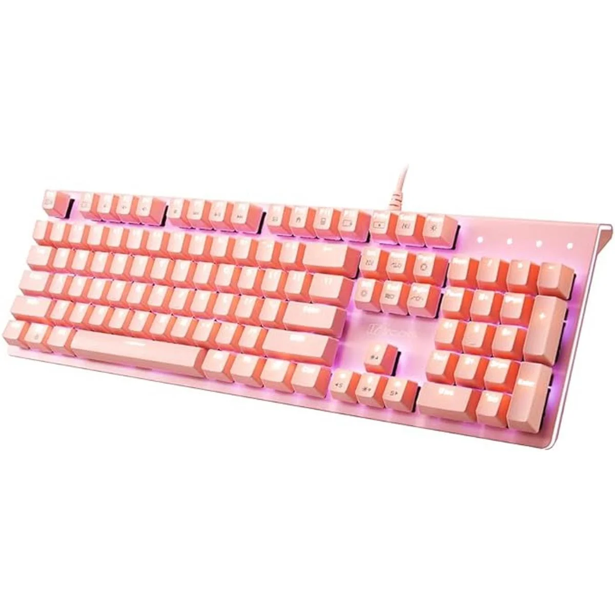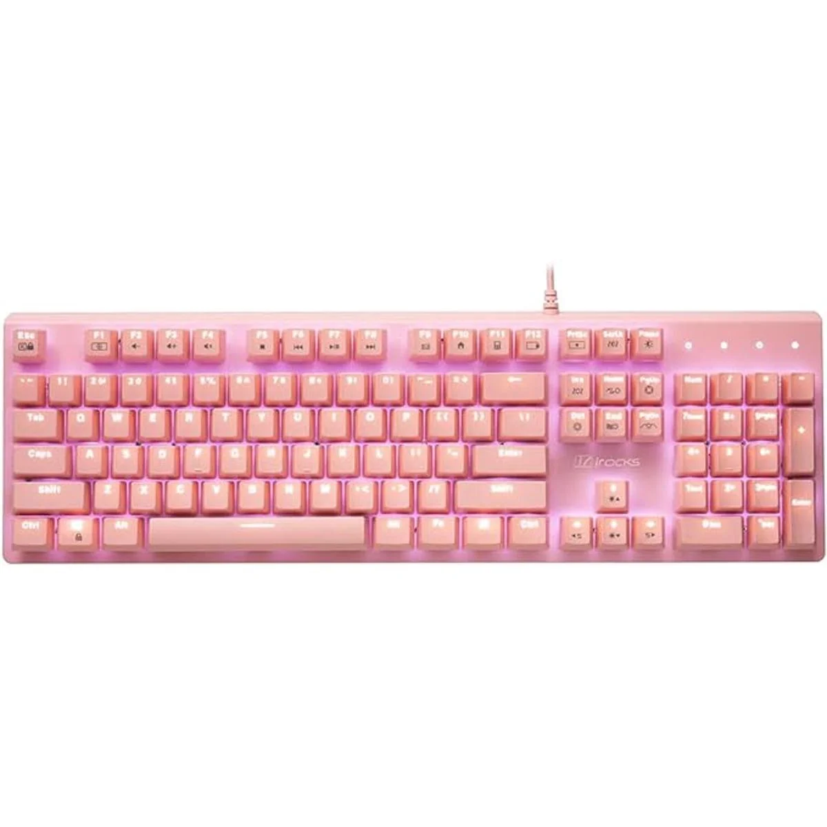 irocks Teclado mecánico iluminado K75M, 104 teclas, con interruptores Cherry MX, teclas PBT, luz LED retroiluminada y teclas de acceso directo, grabadora de luz programable y macro interruptor rojo Cherry MX, rosa