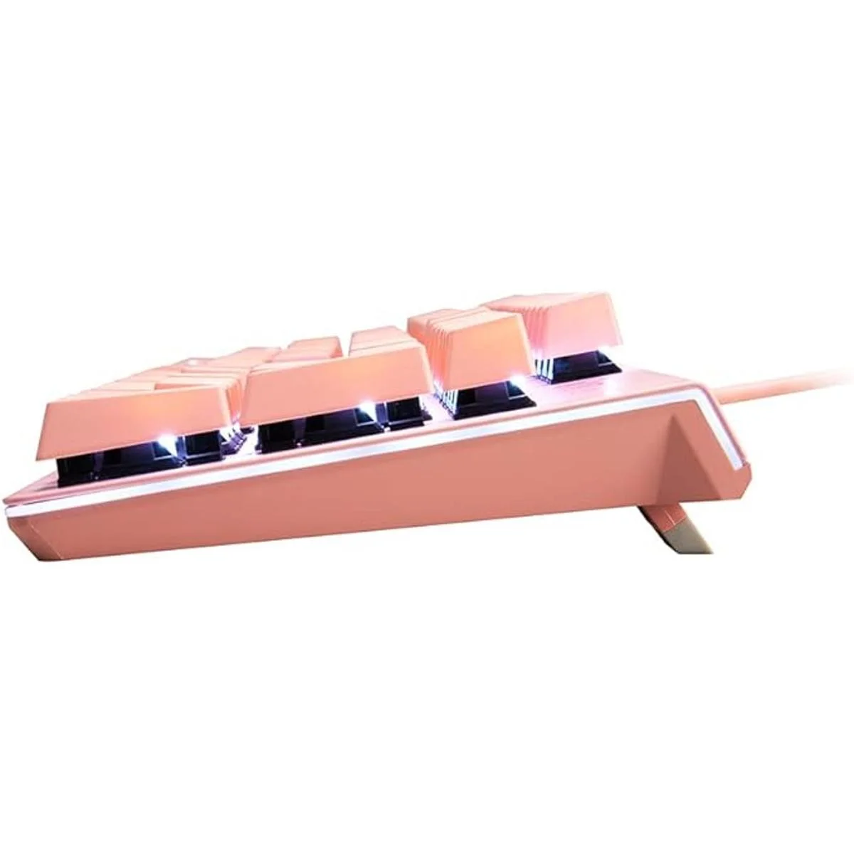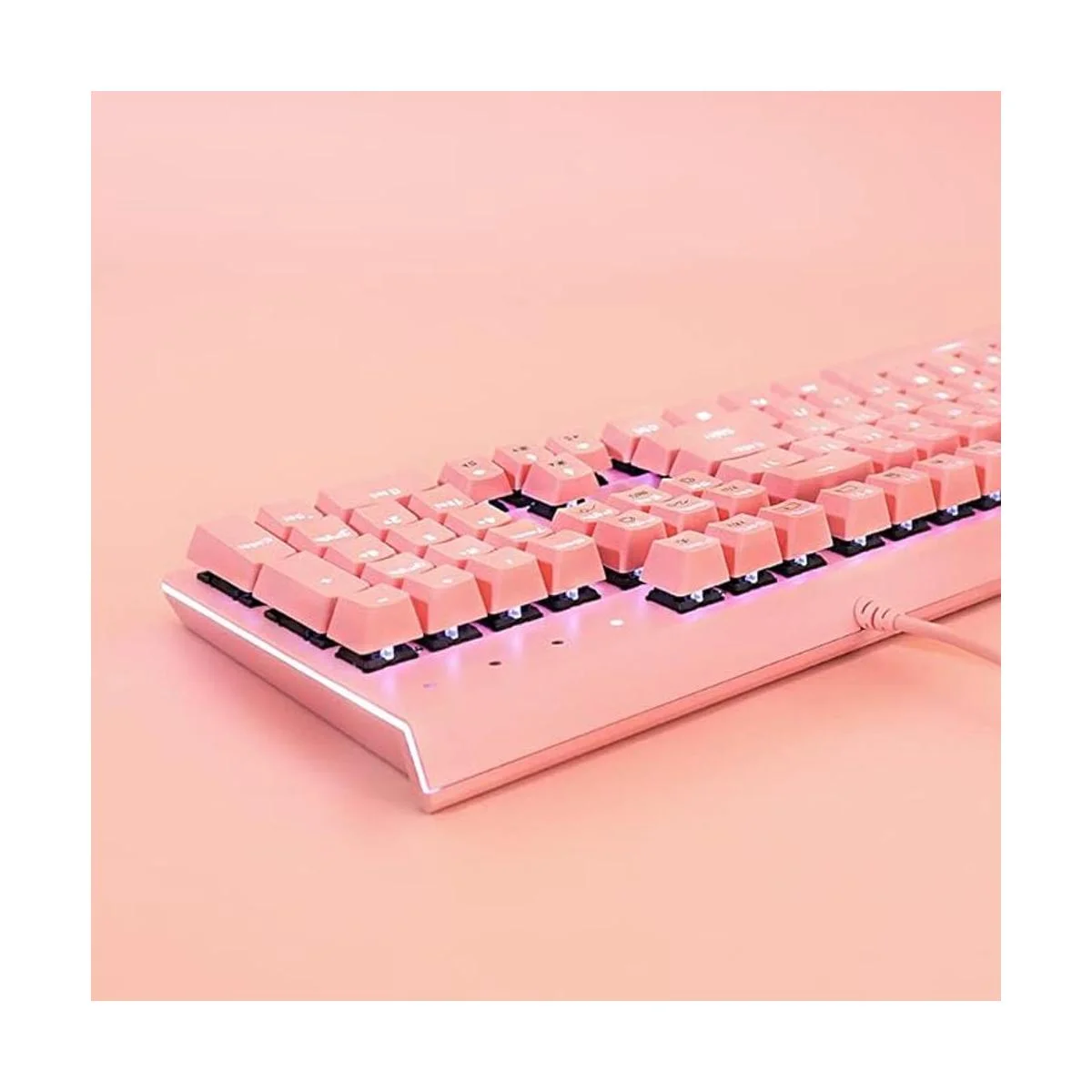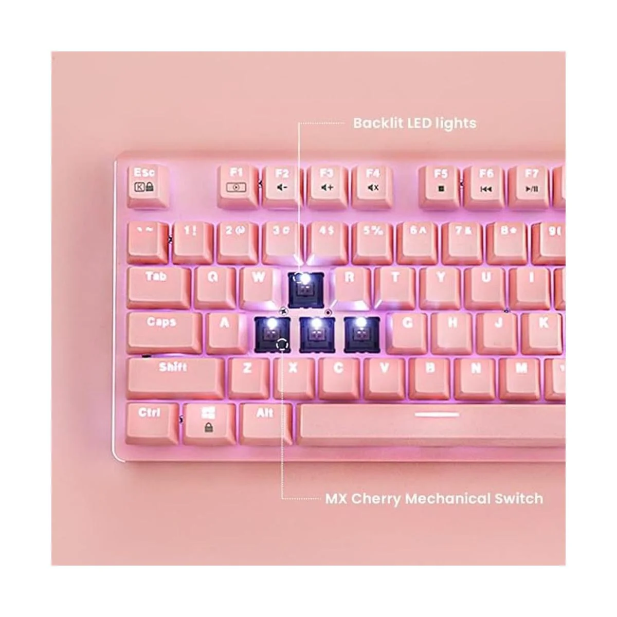 irocks Teclado mecánico iluminado K75M, 104 teclas, con interruptores Cherry MX, teclas PBT, luz LED retroiluminada y teclas de acceso directo, grabadora de luz programable y macro interruptor rojo Cherry MX, rosa
