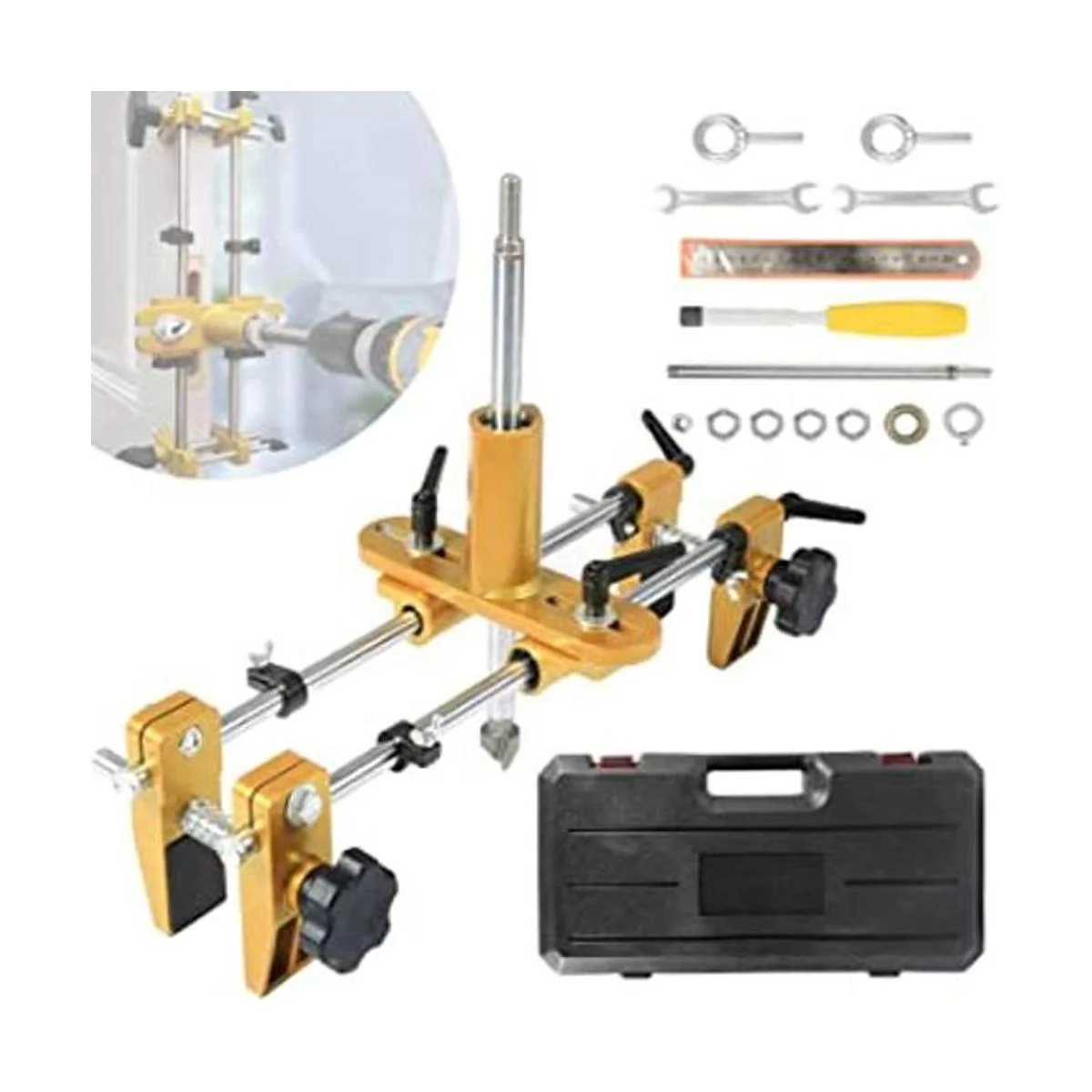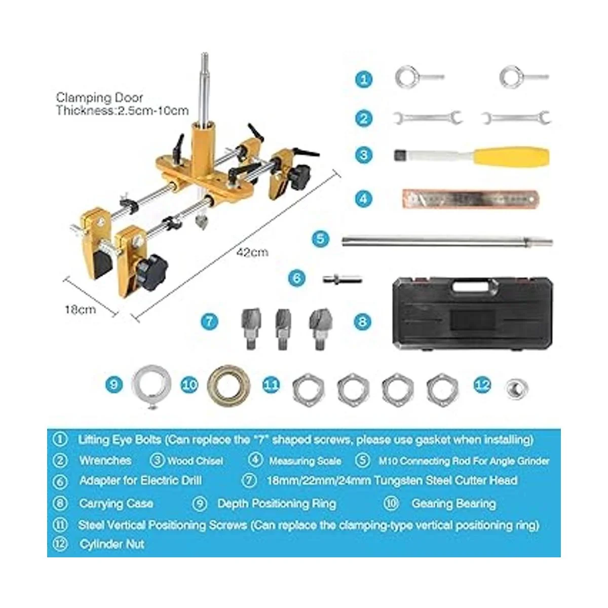 Máquina de mortaja versátil para cerraduras de puerta: el kit de plantilla de bloqueo de puerta IRONWALLS está diseñado para puertas de hogar, puertas de hotel, apertura de agujeros de cerradura, ranurado o modificación, adecuado para cerradura de muesca, cerradura electrónica, bloqueo de contraseña, instalación de bloqueo de huellas dactilares o reemplazo. Viene con una varilla de perforación de amoladora angular de rosca M10 y un adaptador de taladro de mano, este kit de mortaja de bloqueo de puertas se puede utilizar tanto con amoladora angular como con taladro eléctrico.