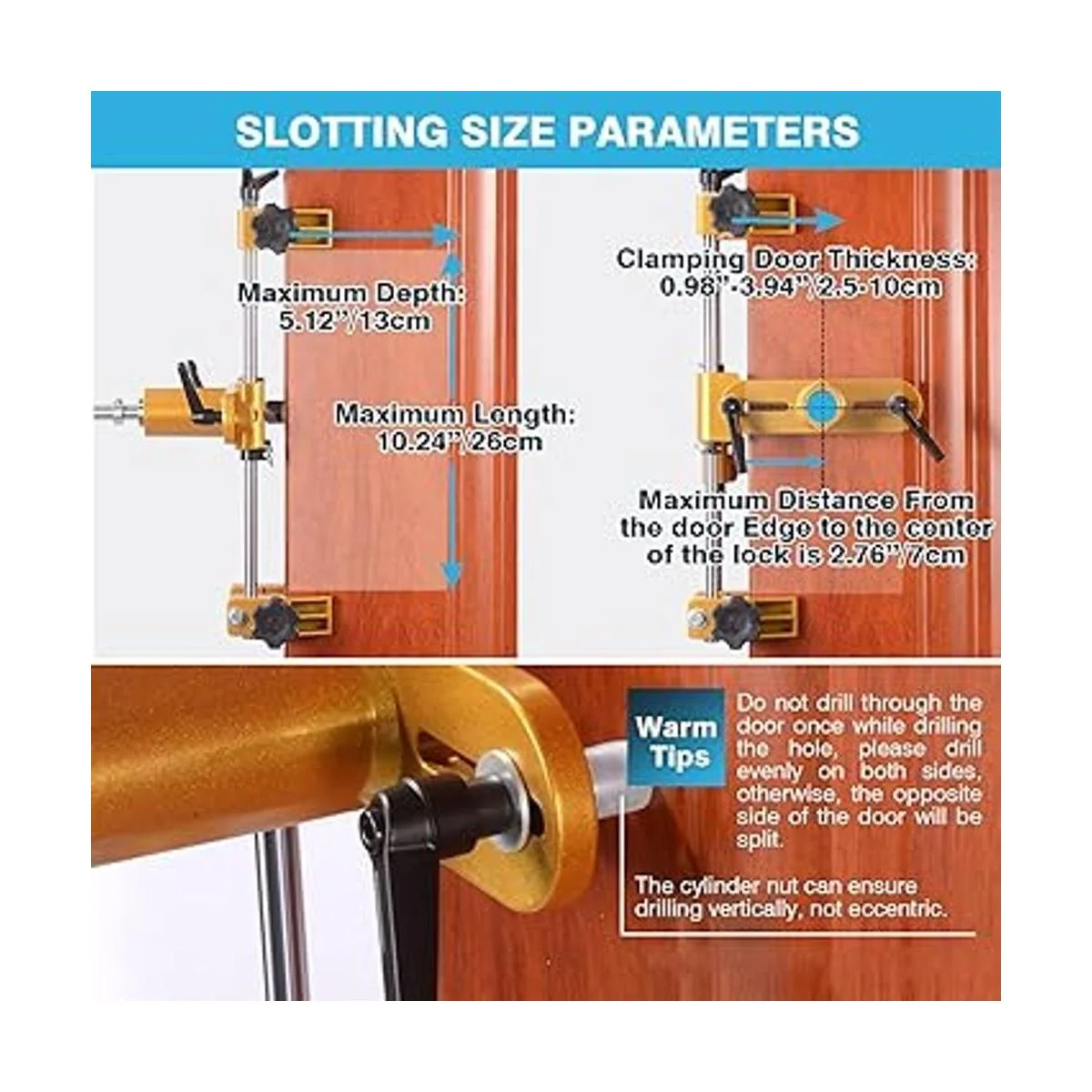 Amplia aplicación: la profundidad máxima de perforación es de 5.1 in; la longitud máxima de deslizamiento es de 10.2 in; el grosor de la puerta es de 2,5 a 3.9 in; la distancia máxima del borde de la puerta al centro de la cerradura es de 2.8 in. Esta plantilla profesional para puertas de madera maciza se adapta a la mayoría de los procesos de instalación de cerraduras de puerta.