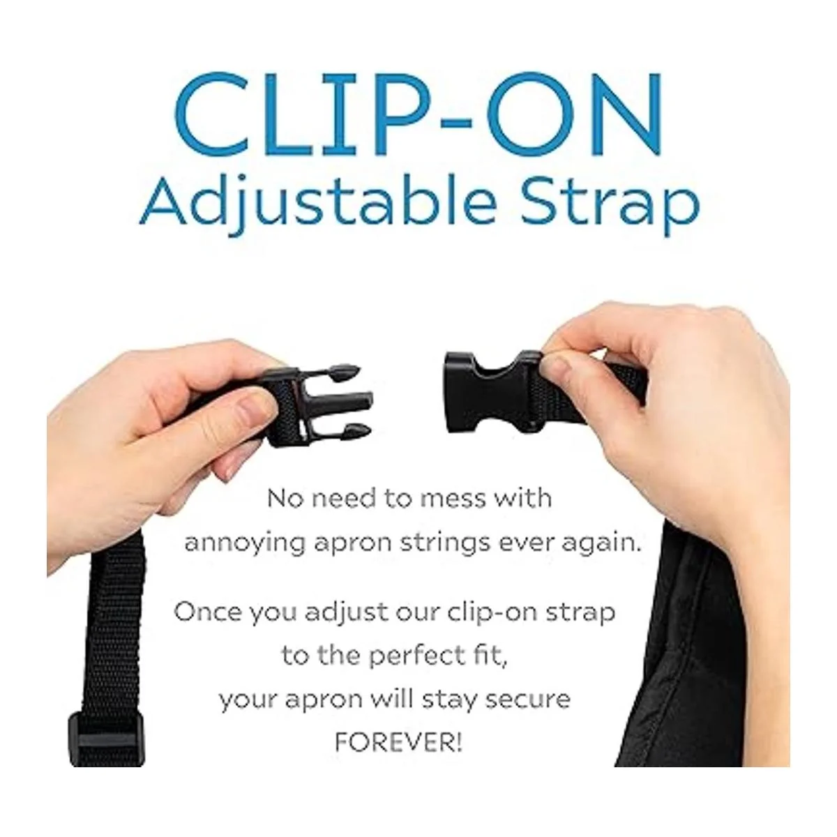 A nuestros clientes les encantan nuestros delantales y a ti también. Correa ajustable con clip. Los delantales con cuerdas pueden ser muy molestos, especialmente tener que volver a ajustarlos una y otra vez. Una vez que ajustes nuestra correa de clip al ajuste perfecto, no tienes que preocuparte por ensuciarte con tu delantal nunca más.