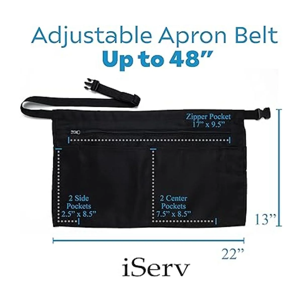 iServ Delantal de cintura negra con 5 bolsillos 22 x 13 pulgadas. Delantal de servidor con clip con bolsillo con cremallera. Medio delantal de restaurante, camarero, camarero, camarero, barista, delantal de dinero, soporte para cheques, organizador, Negro, talla única Se ajusta a todos