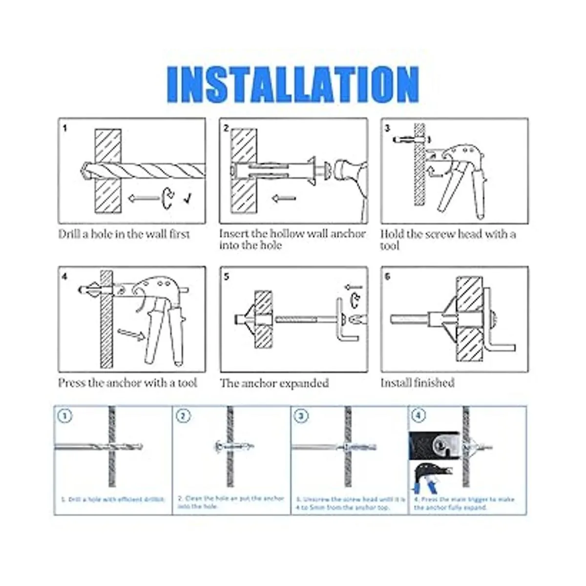 Fácil de usar: simplemente taladra el agujero o clava el ancla en el yeso, coloca el tornillo alrededor de 0.2 in, monta la herramienta y aprieta. La herramienta se engancha y tira del tornillo, ampliando el anclaje perfectamente.
