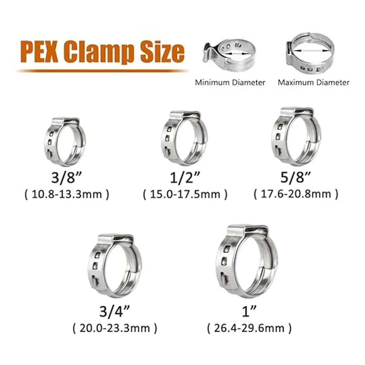 Tamaño: abrazaderas PEX de 1.0 in, para tubos de 26,4 a 1.165 in.