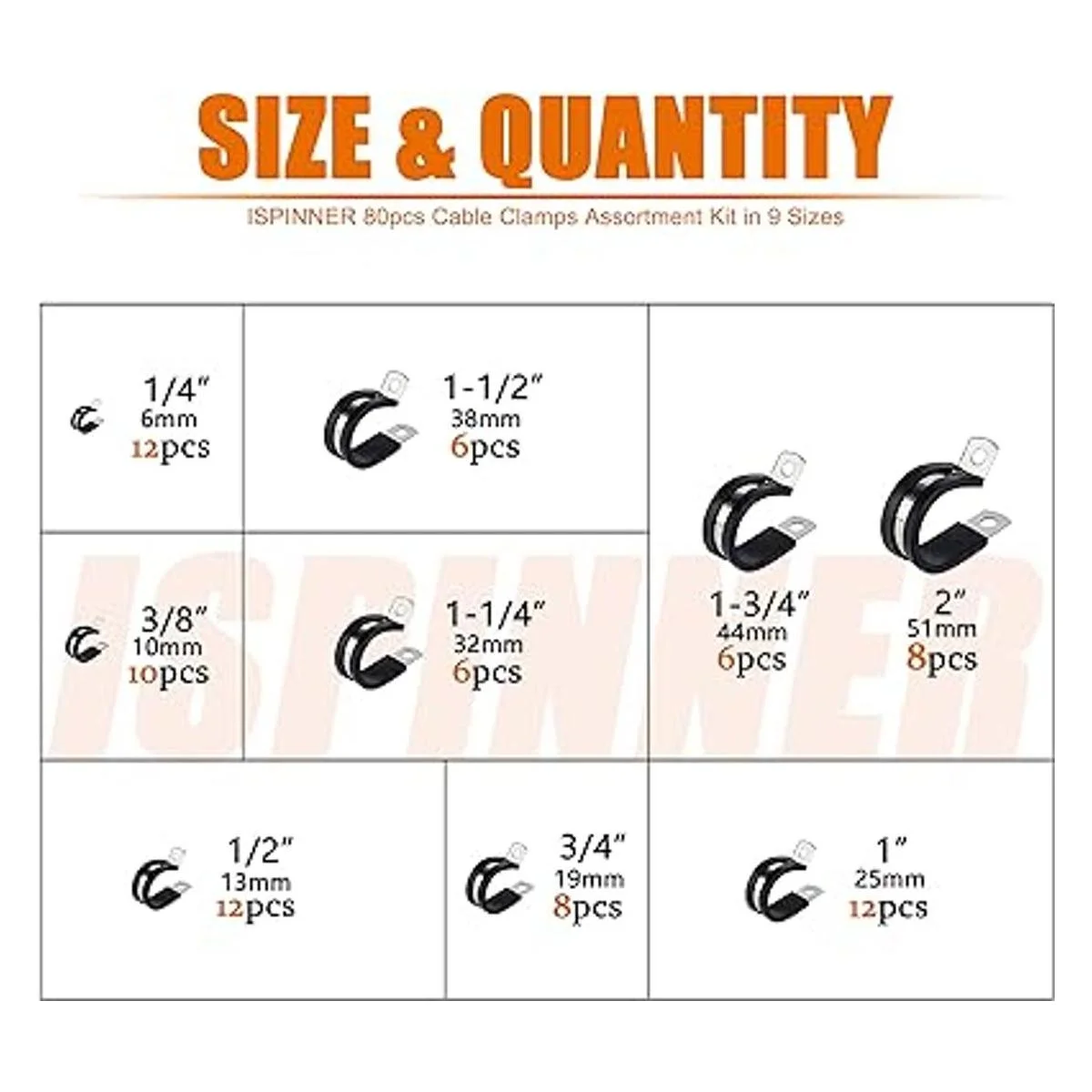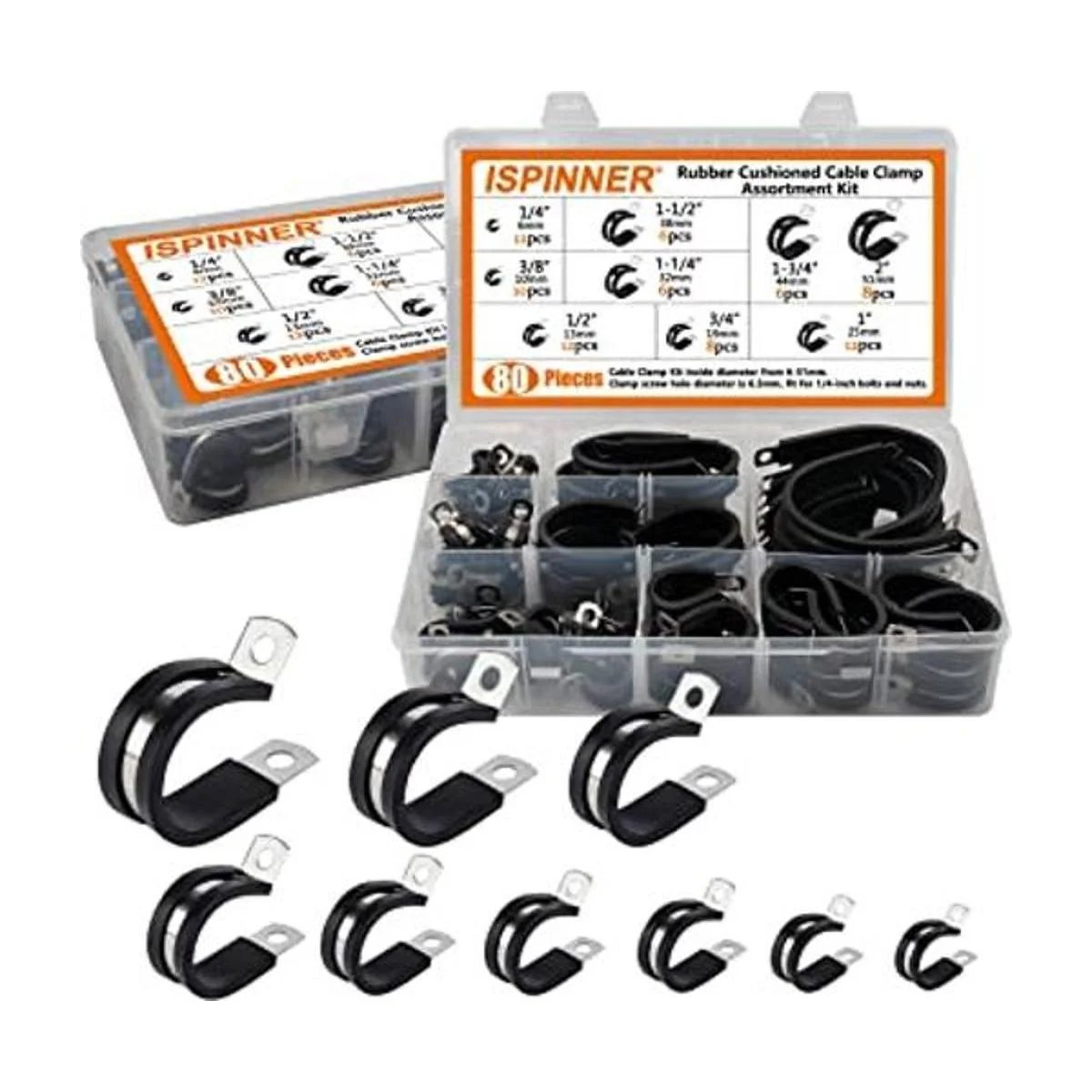 ISPINNER Juego de 80 abrazaderas de cable surtidas, 304 abrazaderas de tubo acolchadas de goma de acero inoxidable en 9 tamaños 2 134 112 114 1 34 12 38 14 14