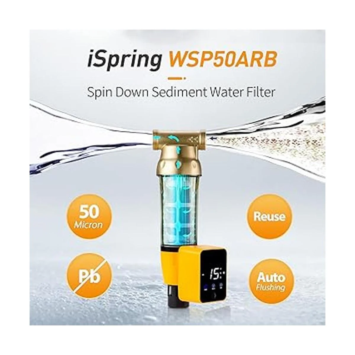 iSpring WSP50ARB Filtro de agua de sedimentos giratorios, reutilizable con módulo de descarga automática de pantalla táctil y raspador de carcasa integrado, carcasa transparente superior de latón, 50 micras